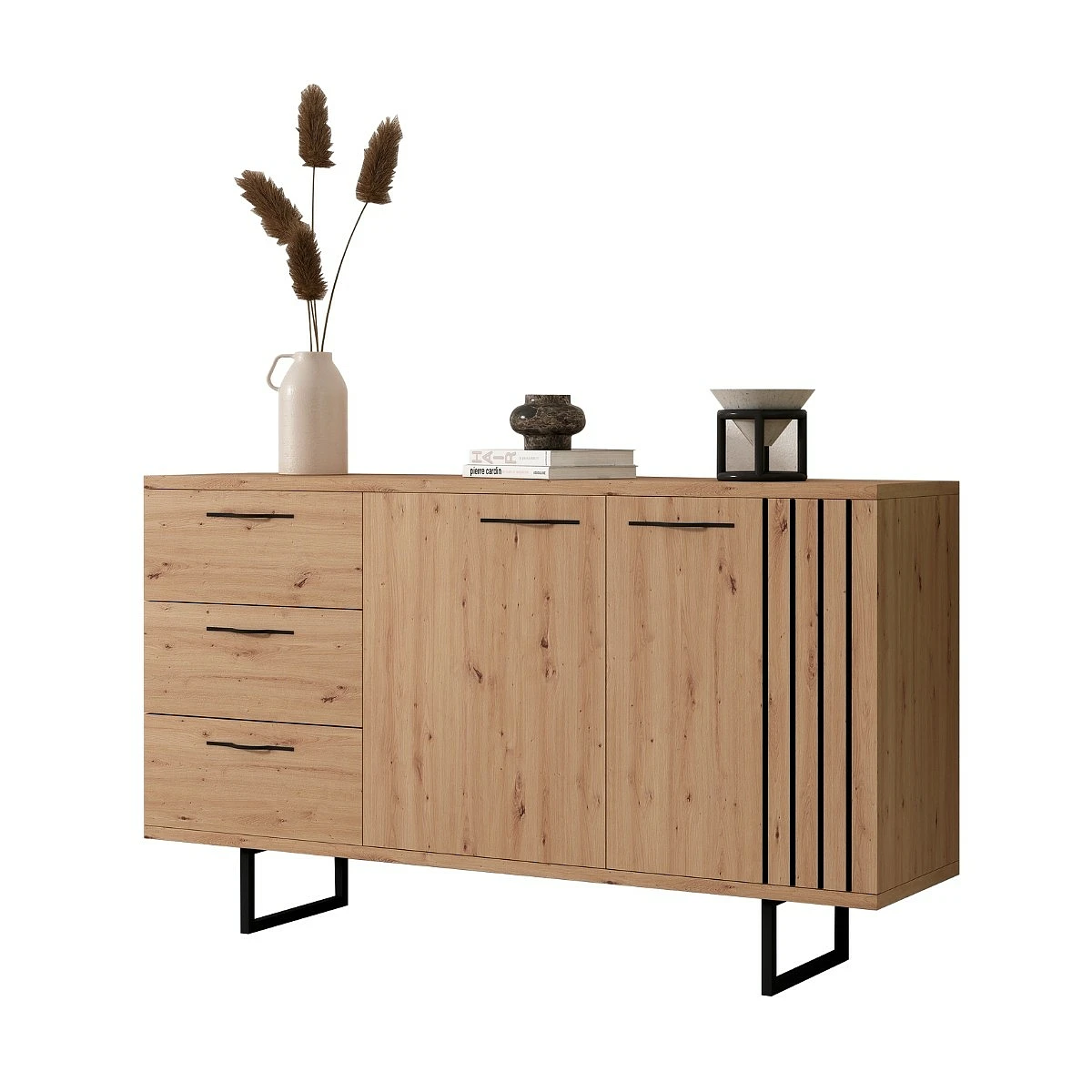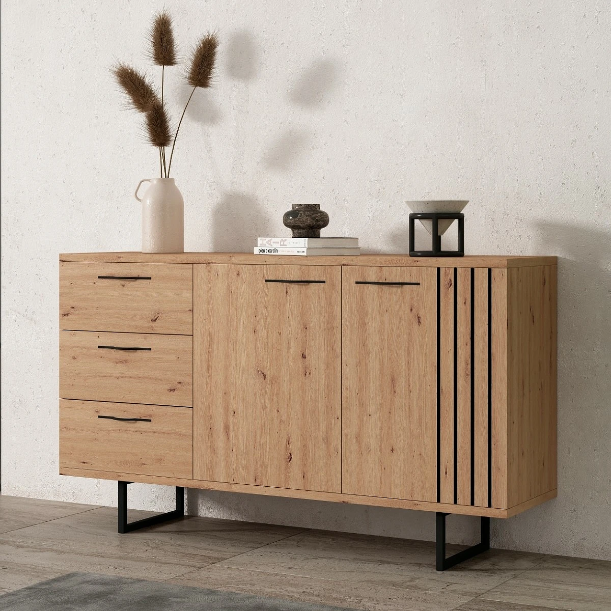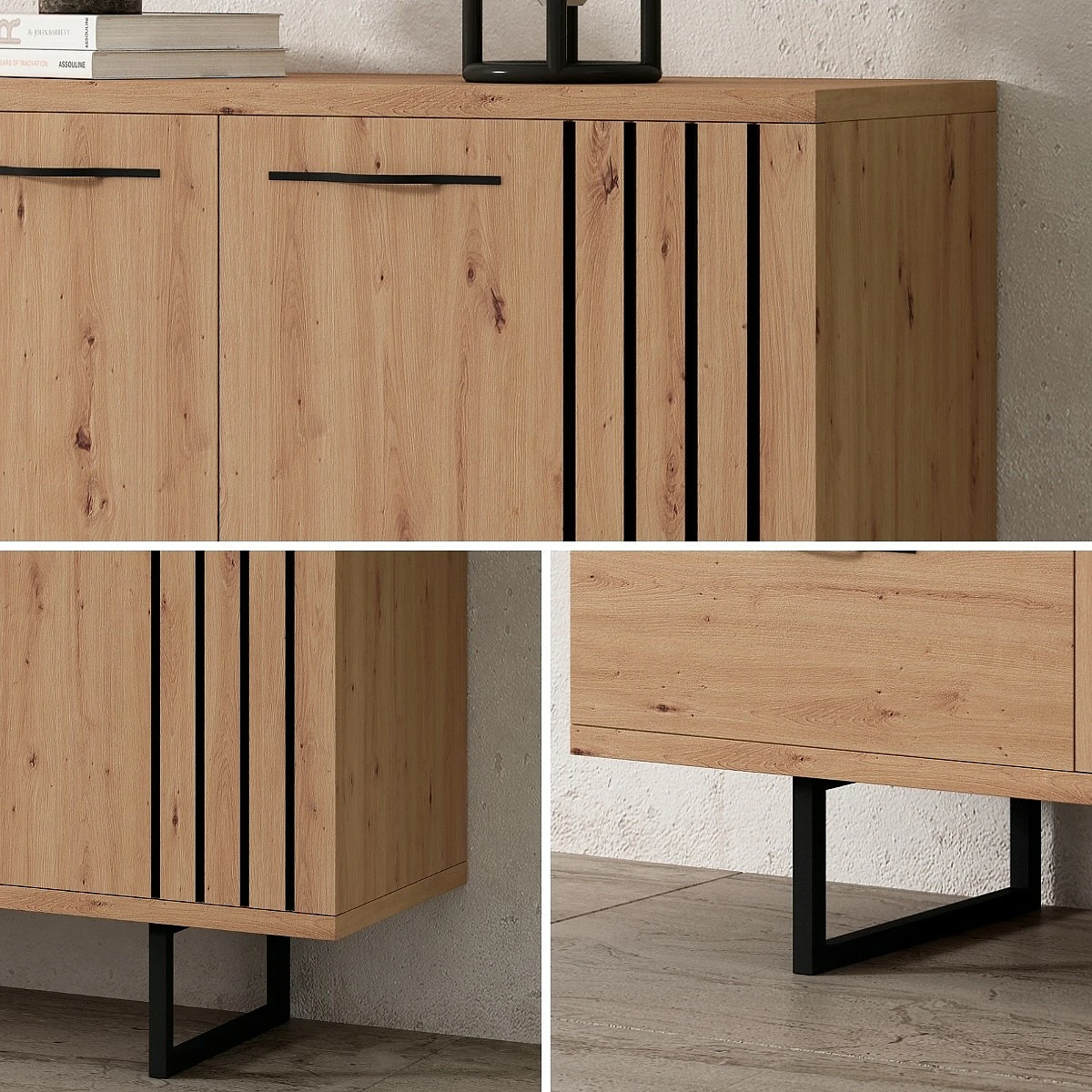 Gracias a su acabado en roble natural, este aparador de salón se integra perfectamente en ambientes escandinavos, modernos o rústicos. Sus líneas sencillas, realzadas por los tiradores y detalles en negro, lo convierten en una pieza clave para crear espacios acogedores y con estilo.