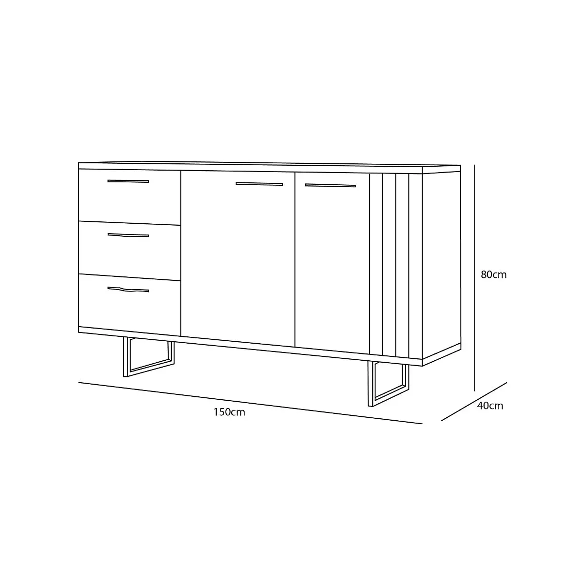 Este aparador roble de 150x80x40cm destaca por su diseño funcional y elegante. Sus tres cajones laterales son perfectos para almacenar desde cubiertos y mantelería hasta documentos y pequeños objetos. Las dos puertas con baldas interiores permiten mantener ordenados platos, vajillas u otros elementos de mayor tamaño.