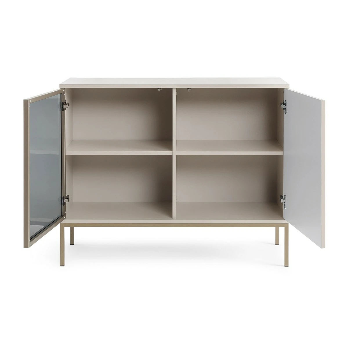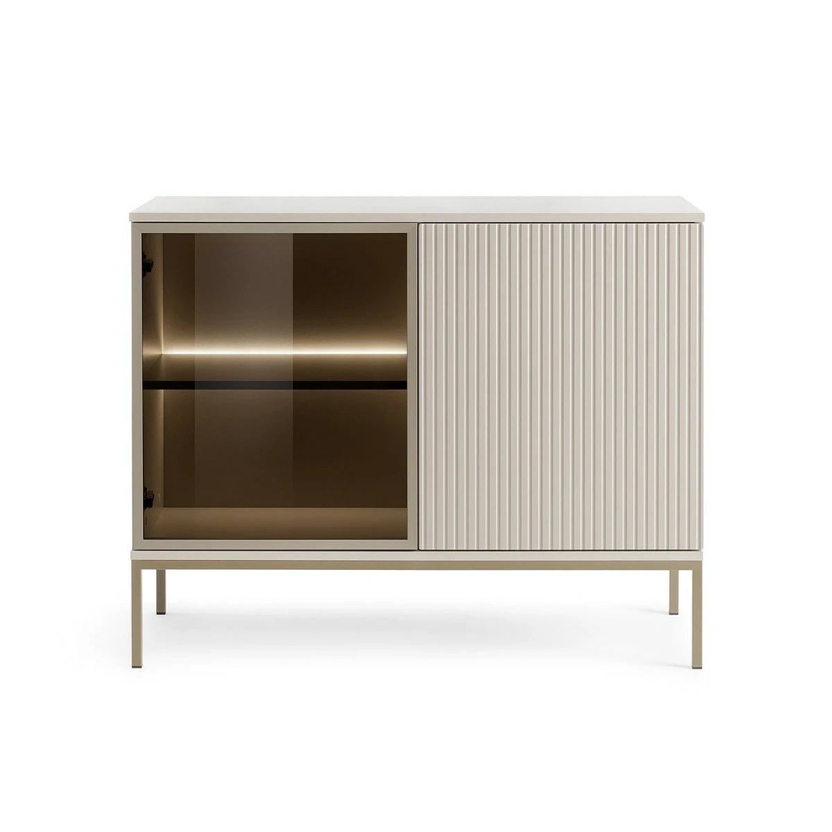 Cada detalle de este aparador está diseñado para combinar forma y función. Las patas metálicas elevadas le otorgan un aire liviano y elegante, y facilitan la limpieza del suelo. El contraste entre la textura vertical y el vidrio ahumado ofrece un juego visual atractivo que aporta profundidad y carácter al mueble.