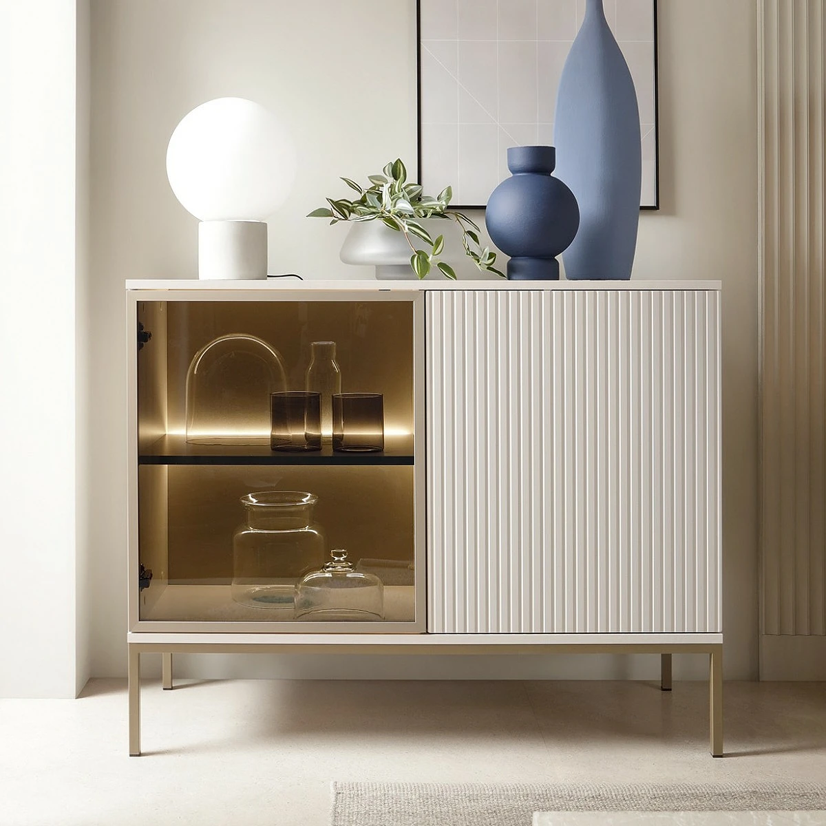 Este aparador es perfecto para acompañar estilos decorativos modernos, nórdicos o japandi. Puedes colocarlo bajo un espejo redondo, decorarlo con jarrones altos o añadir una lámpara de mesa para completar la escena. Su iluminación LED convierte el interior en un punto focal cuando cae la noche, realzando cada detalle.