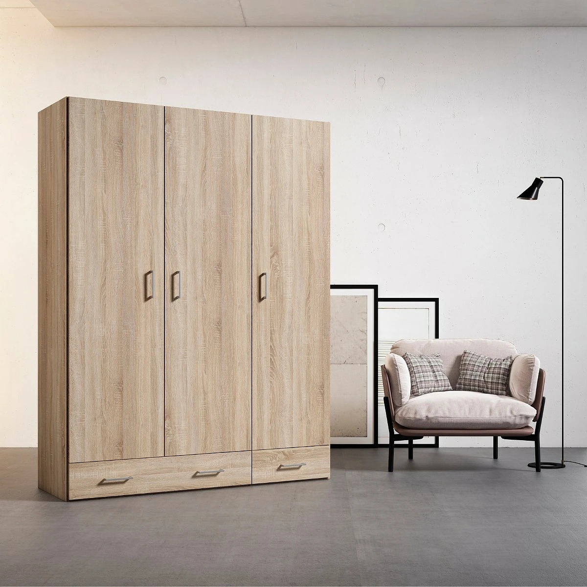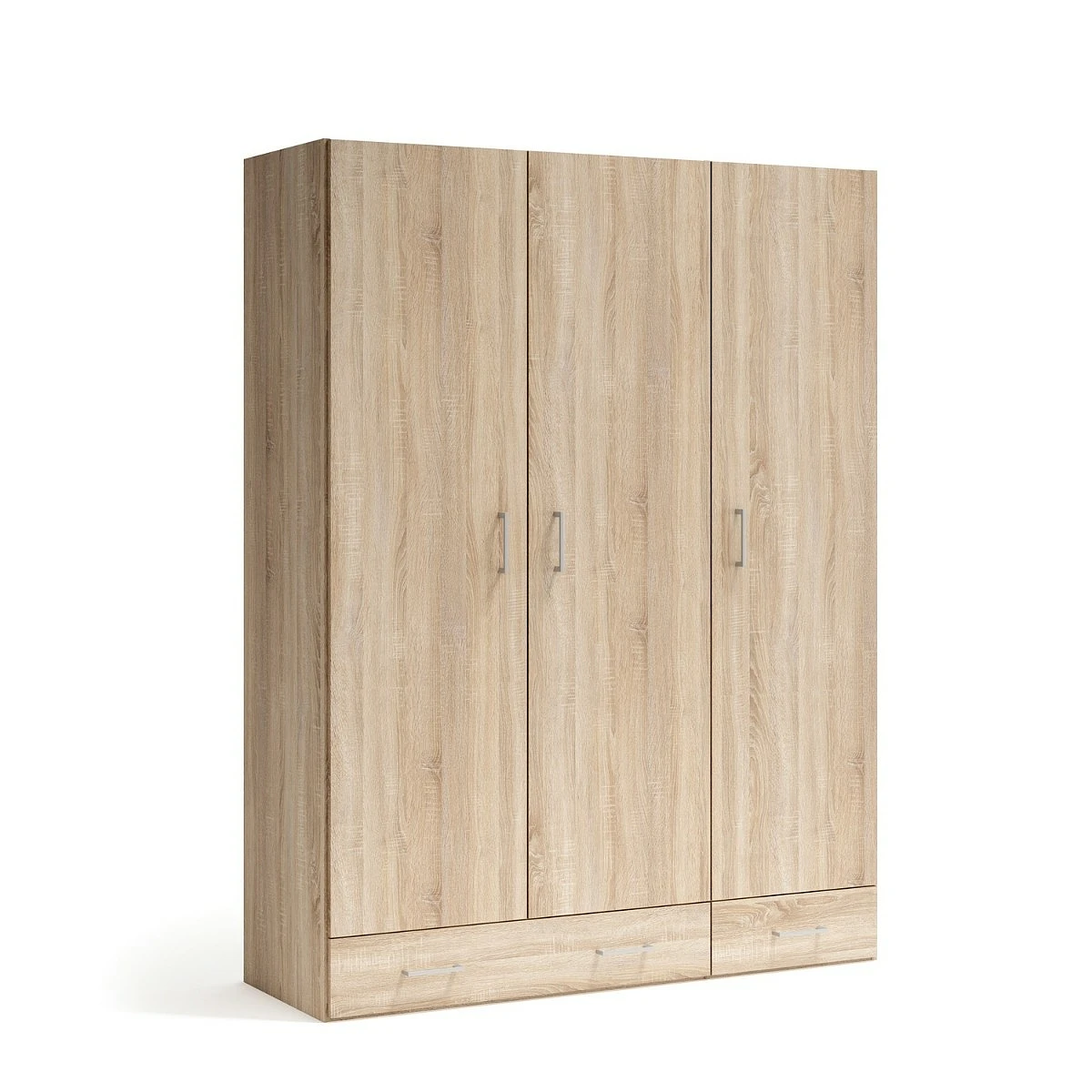 Con sus 3 puertas y 2 cajones, este armario ofrece una solución integral para el almacenamiento de ropa, calzado y complementos. La parte central permite colgar prendas largas y delicadas, mientras que los espacios laterales o cajones sirven para ropa doblada, ropa de cama o accesorios. Es un mueble muy completo para quienes necesitan capacidad sin sacrificar orden ni estética.