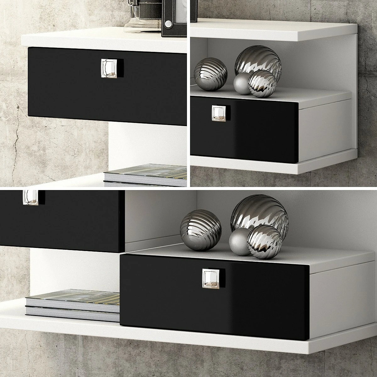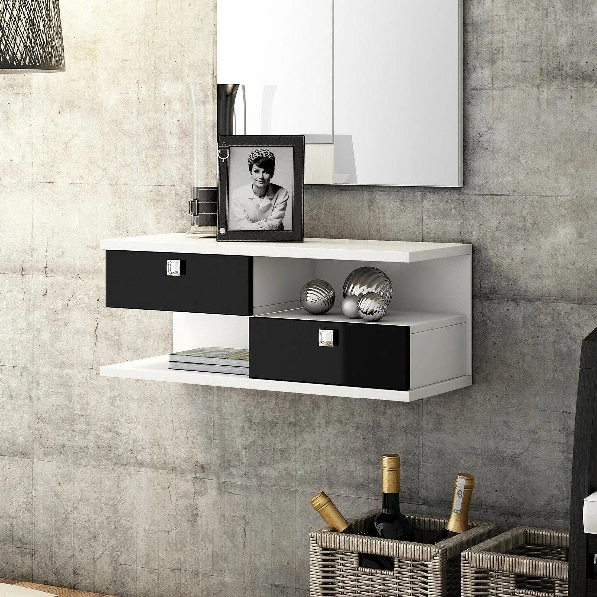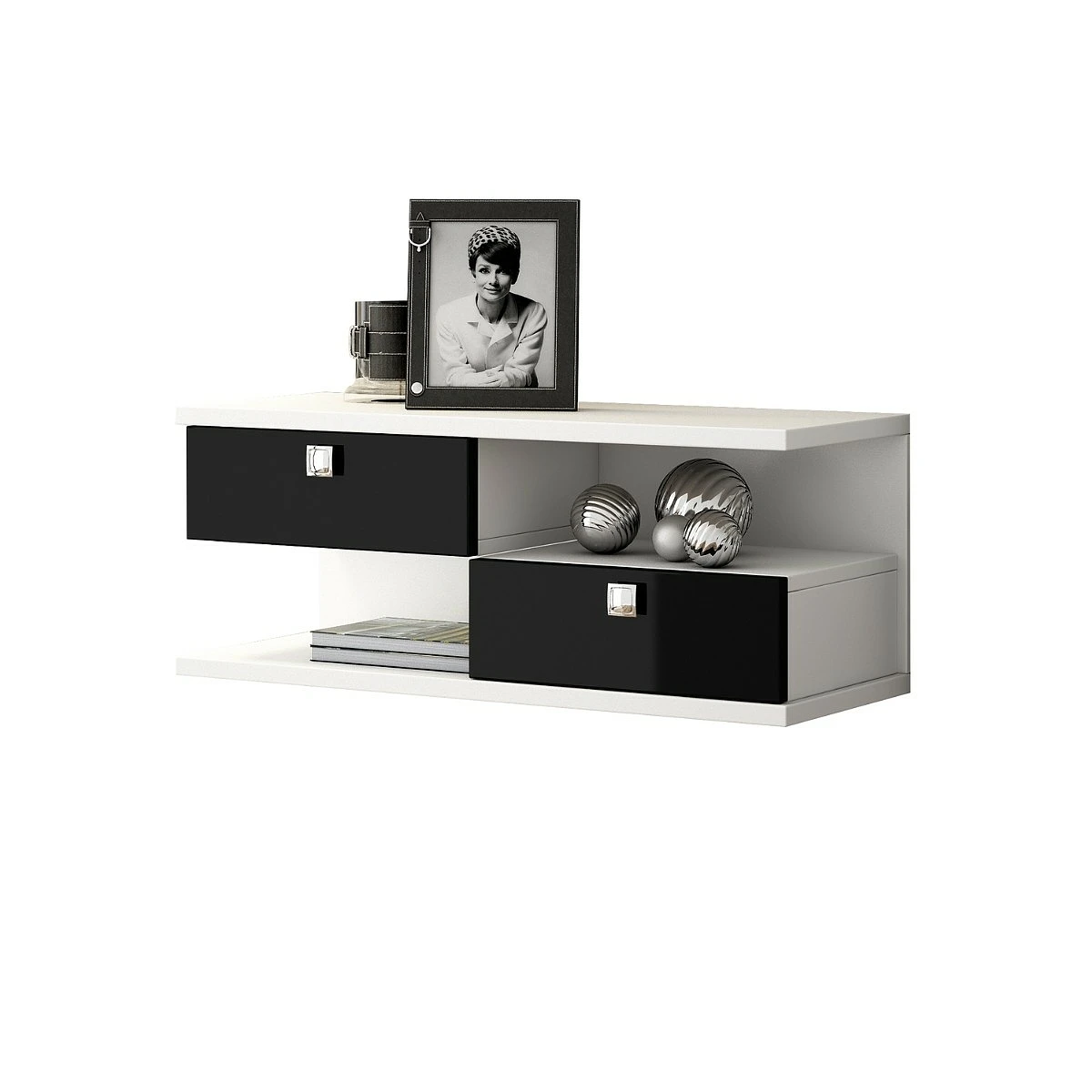 Sus dos cajones permiten ocultar objetos pequeños como llaves, cartas o cargadores, mientras que el estante abierto inferior resulta ideal para libros o detalles decorativos. Cada elemento ha sido pensado para aportar orden visual con un toque de modernidad.