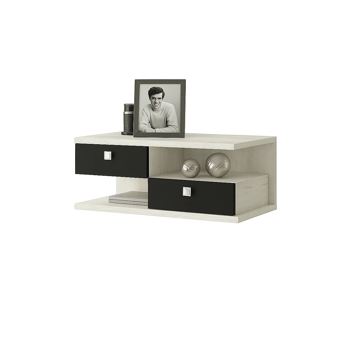 Sus dos cajones permiten ocultar objetos pequeños como llaves, cartas o cargadores, mientras que el estante abierto inferior resulta ideal para libros o detalles decorativos. Cada elemento ha sido pensado para aportar orden visual con un toque de modernidad.