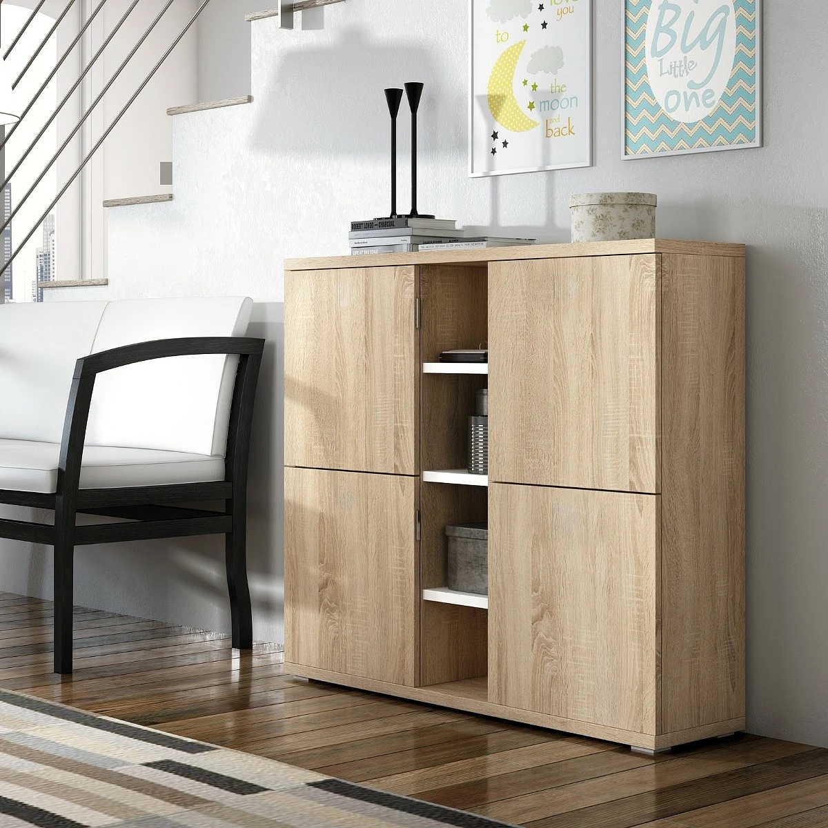 Este mueble auxiliar de 100x90x28cm ha sido diseñado para aportar orden y armonía a cualquier estancia. Las cuatro puertas laterales ocultan espacios amplios para guardar vajillas, documentos, ropa o artículos del día a día.