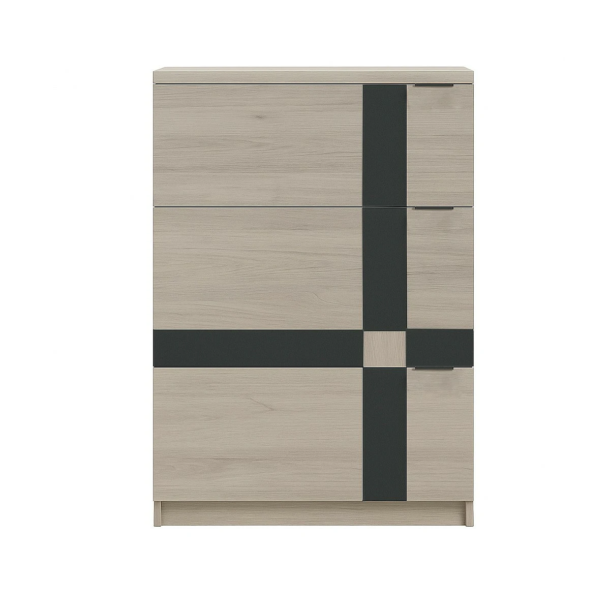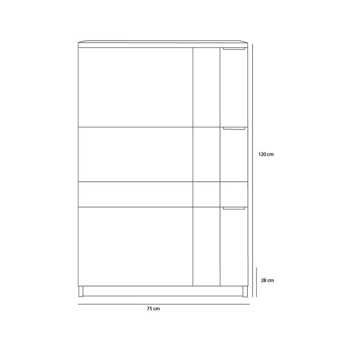 Este zapatero de 75x120x28cm está pensado para ofrecer gran capacidad de almacenaje en un espacio compacto. Las 3 puertas abatibles permiten almacenar varios pares de zapatos de manera ordenada y accesible, manteniendo siempre el ambiente despejado.