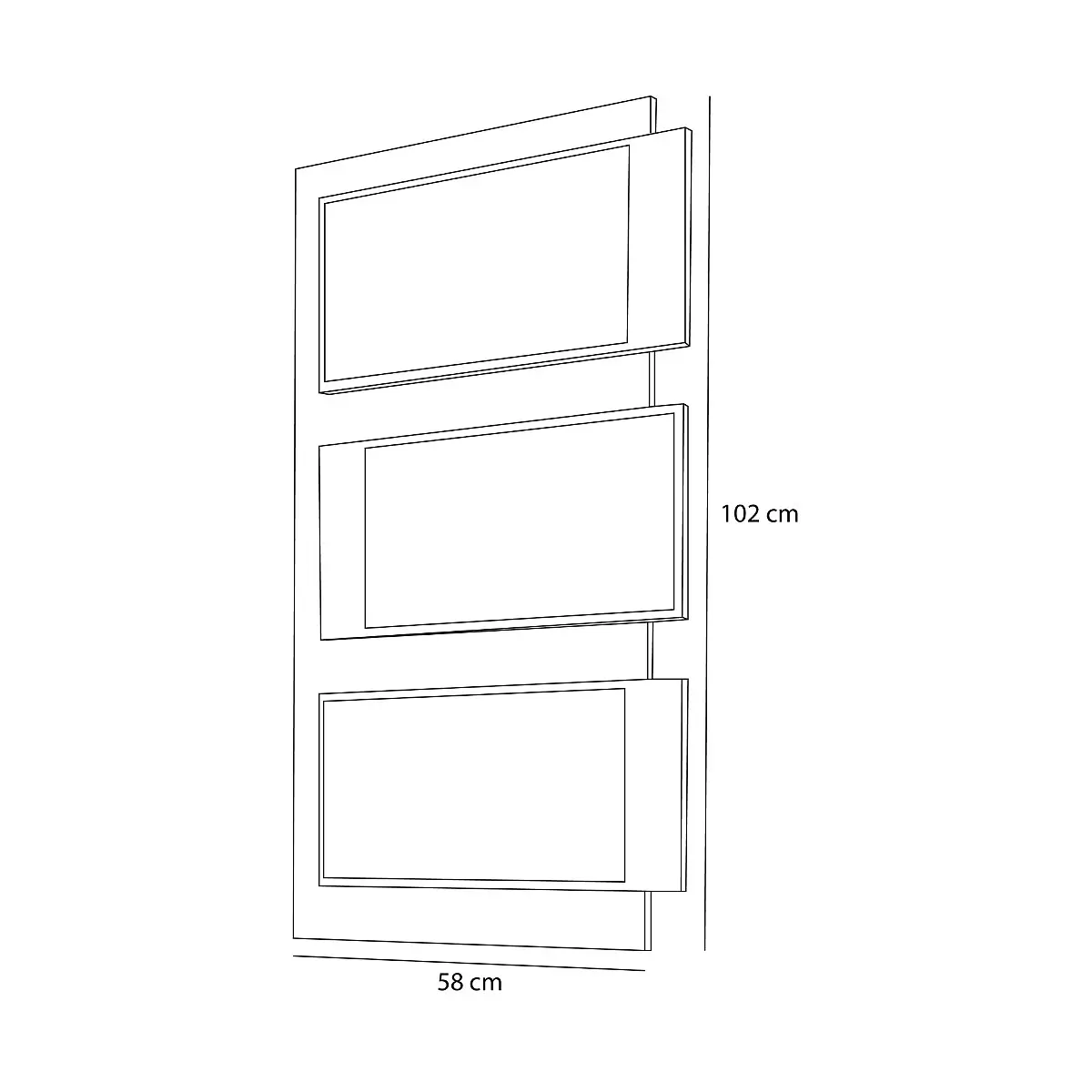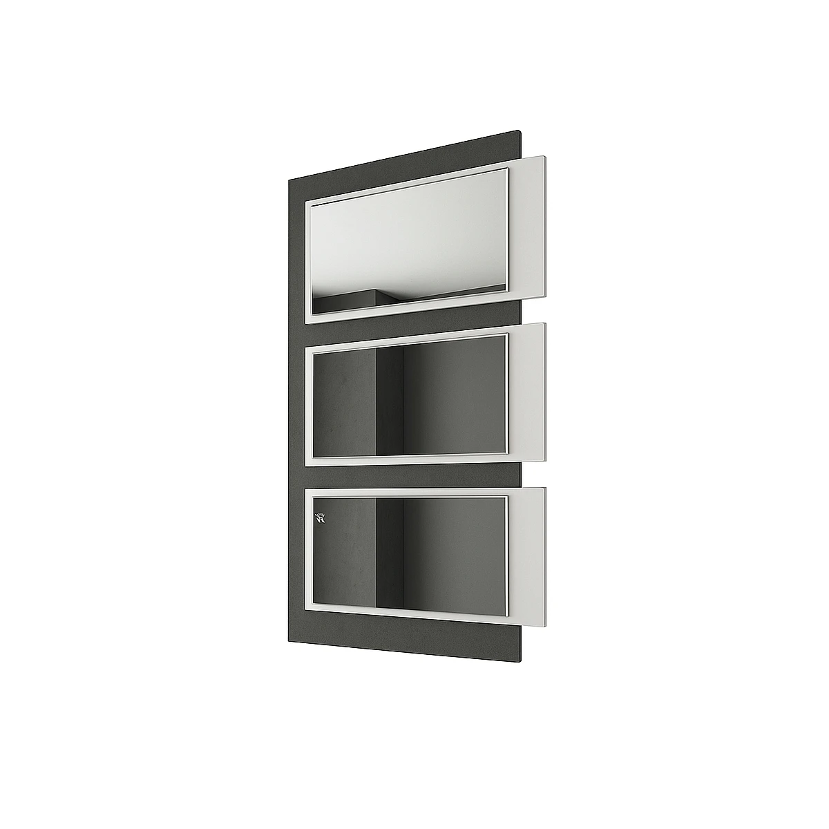 Este espejo va más allá de lo funcional: su diseño de tres paneles superpuestos genera profundidad y movimiento visual. La combinación de acabados blanco brillante con tonos cálidos como el cambrian o más sobrios como el grafito lo convierte en una pieza versátil para distintos estilos decorativos.