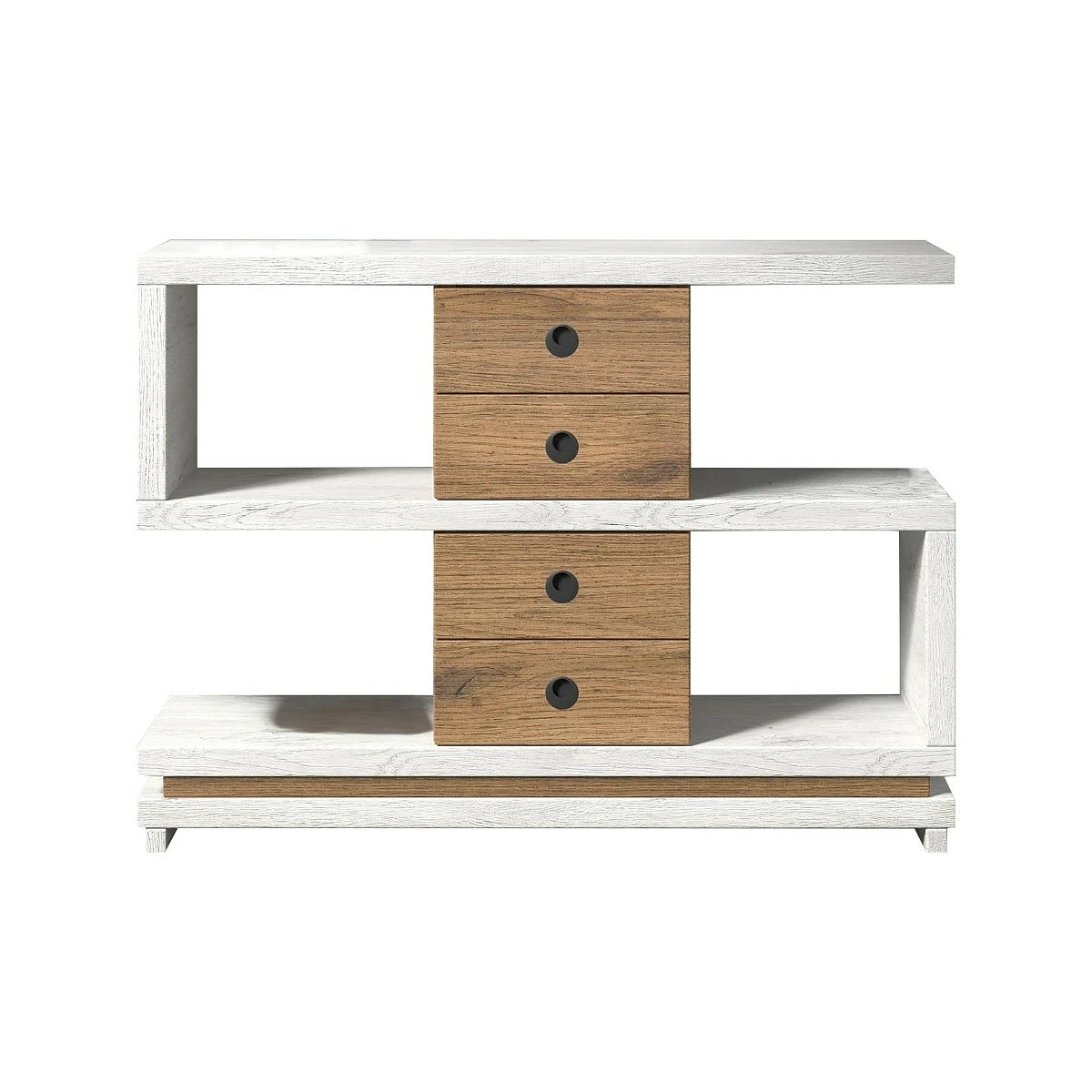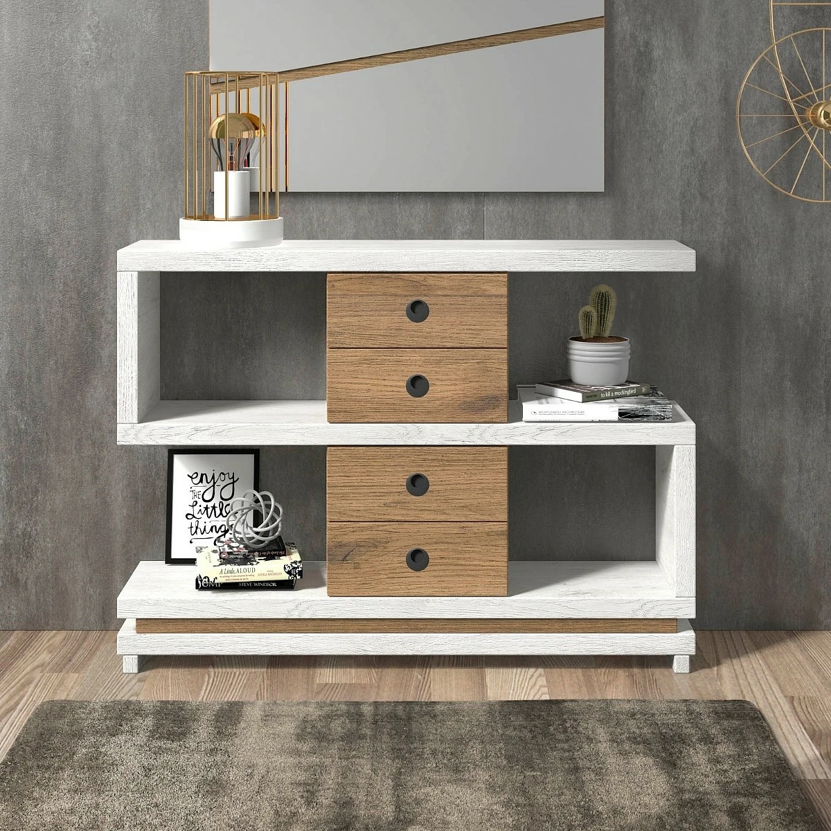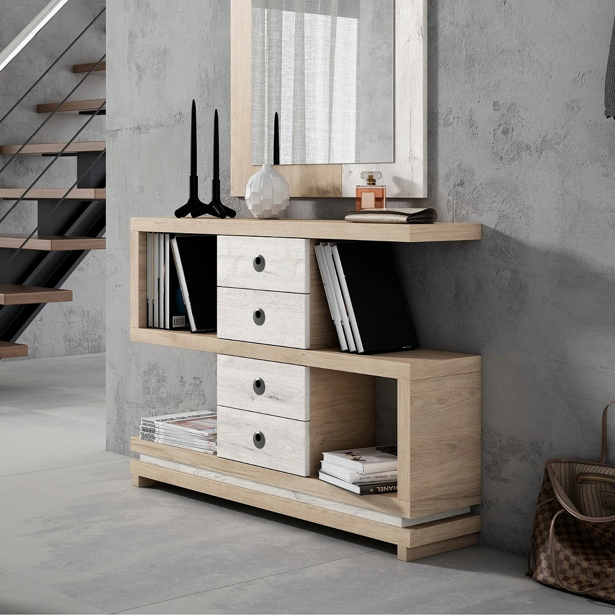 Este recibidor aprovecha su estructura de tres niveles para ofrecer almacenaje funcional y decorativo al mismo tiempo. Los cajones centrales, dispuestos verticalmente, aportan orden a objetos pequeños, mientras que los laterales abiertos permiten exhibir libros, plantas o portarretratos. Las combinaciones de color potencian contrastes elegantes con un aire moderno.