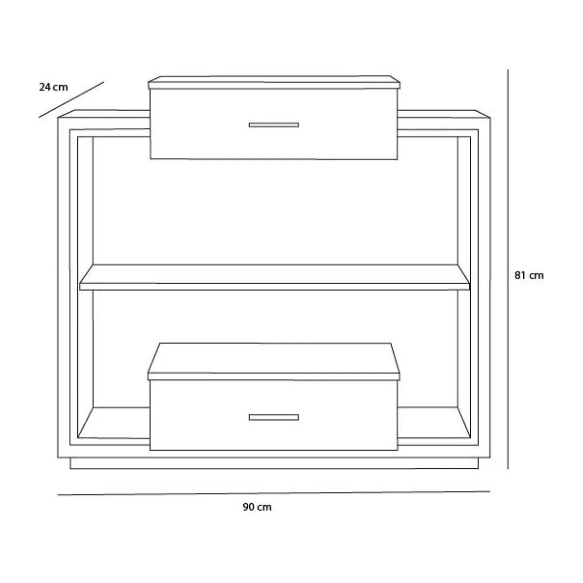 • Composición: Dos cajones (superior e inferior) + un estante central abierto
