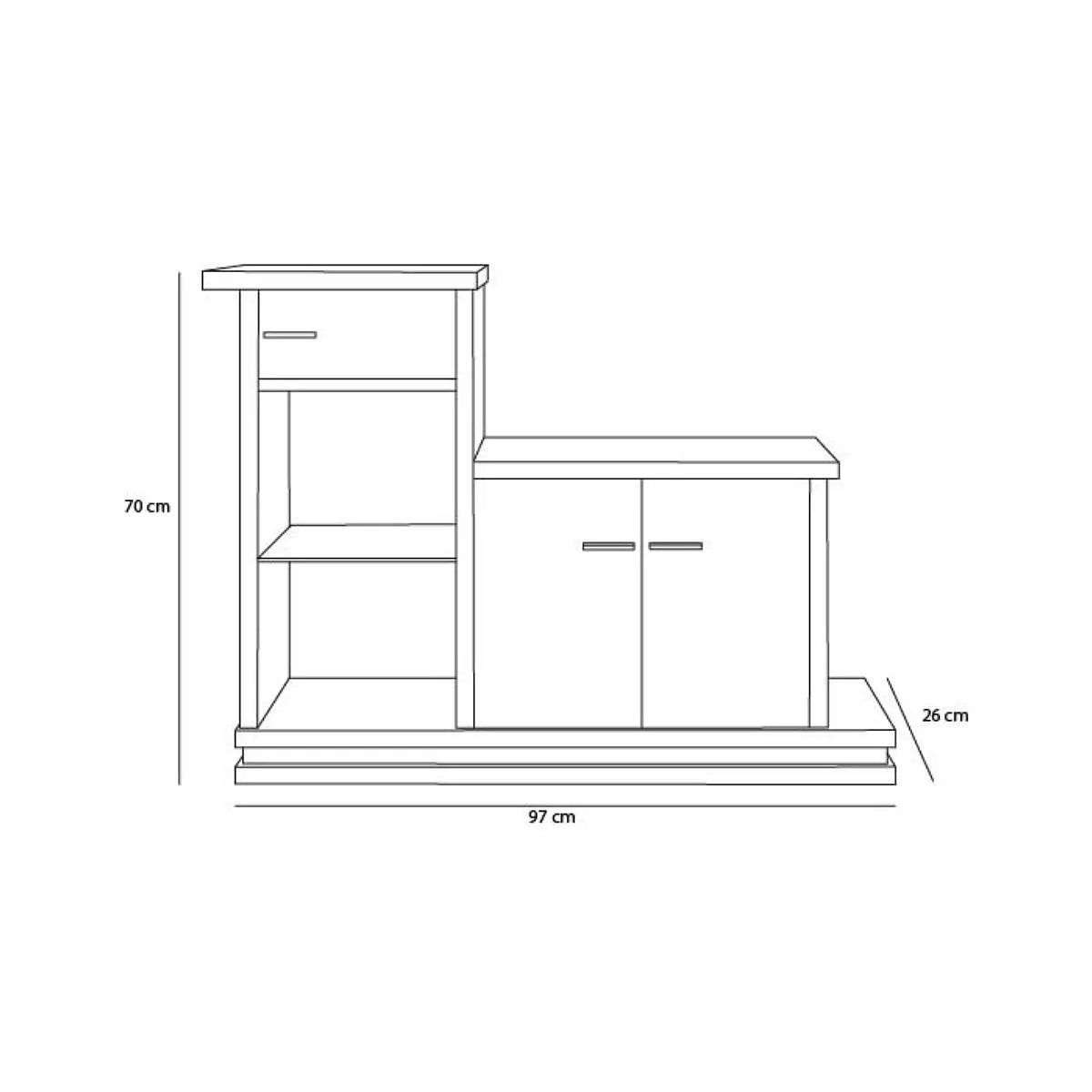 Este recibidor de 97 cm está pensado para ofrecer soluciones de almacenaje en muy poco espacio. Su fondo de solo 26 cm lo hace perfecto para zonas de paso, como pasillos o entradas angostas. A pesar de su tamaño reducido, su distribución inteligente permite guardar una gran variedad de objetos, desde papelería hasta pequeños elementos decorativos.