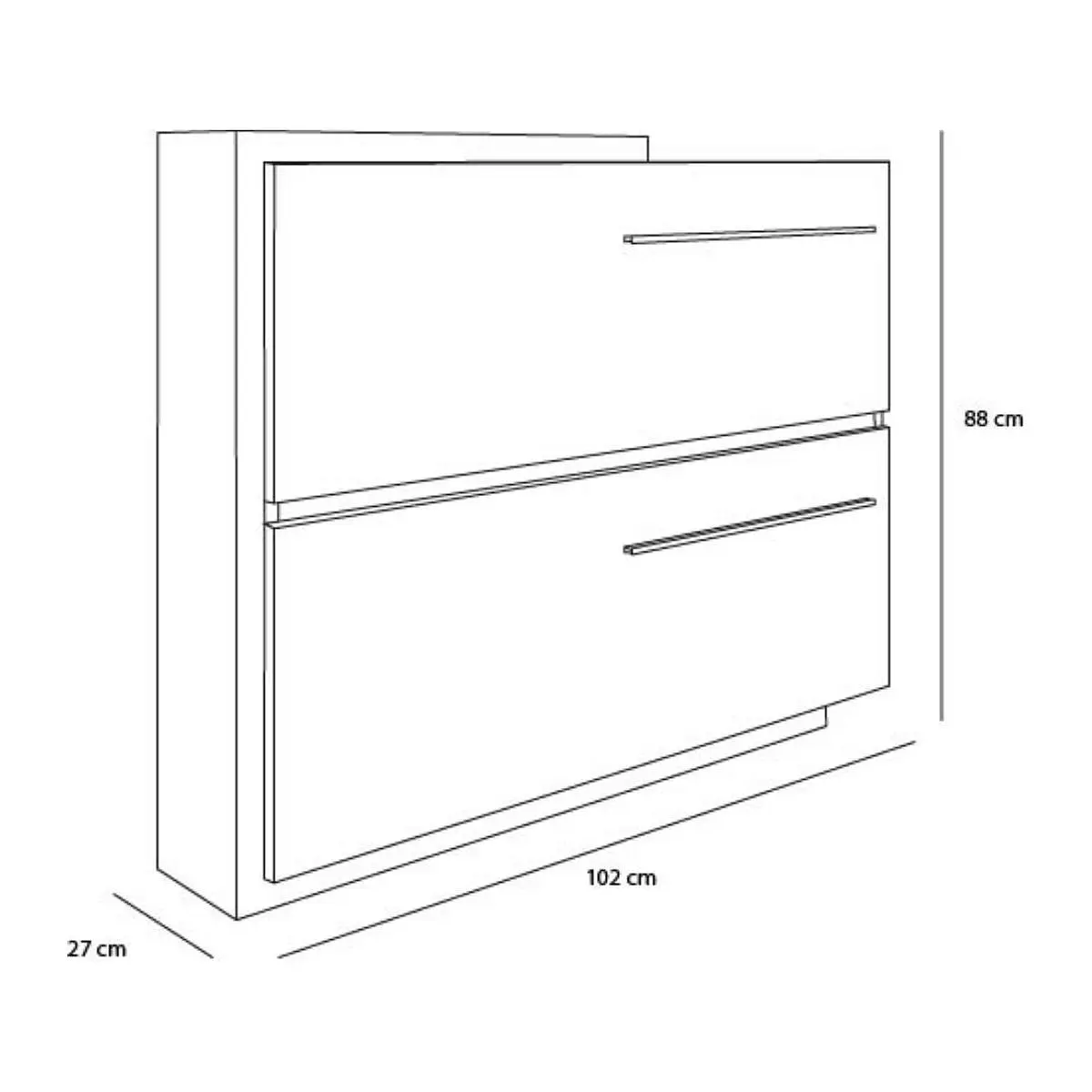 A pesar de su amplitud, este mueble tiene un fondo reducido de solo 27 cm, lo que lo hace ideal para espacios estrechos o zonas de paso. Su diseño compacto permite optimizar el espacio sin renunciar a capacidad de almacenamiento ni a la estética.