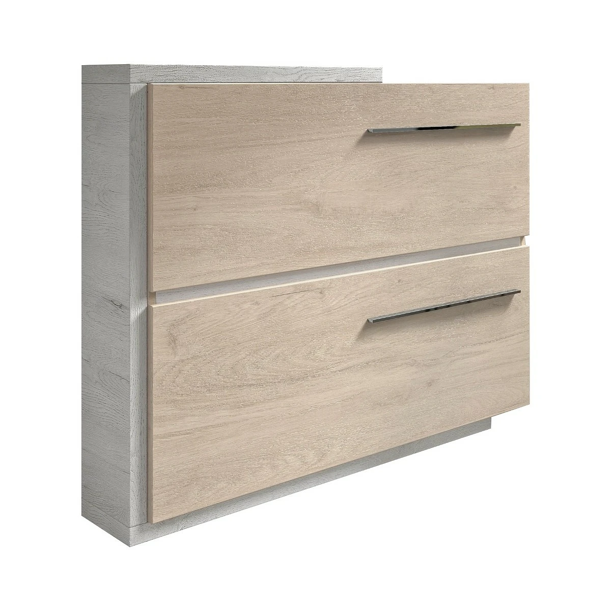 El acabado Mozart, en blanco veteado, aporta claridad visual y modernidad, mientras que el frente en Aurora ofrece la calidez y naturalidad de la madera clara. Esta combinación equilibra perfectamente luminosidad y textura, lo que permite integrar la pieza en una gran variedad de estilos decorativos.