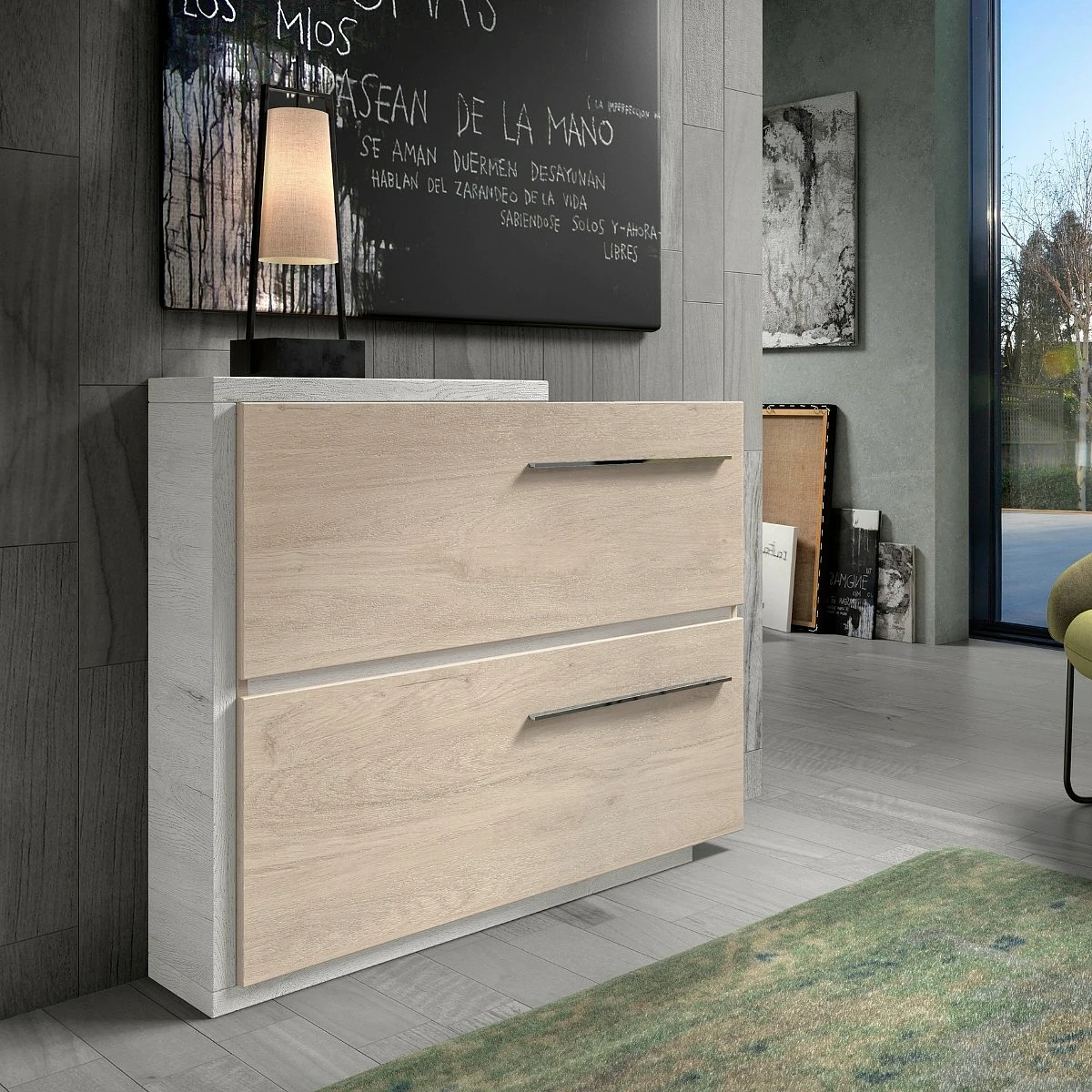 Este mueble no solo aporta orden, también es una pieza decorativa en sí misma. Puede actuar como protagonista en un recibidor o integrarse como elemento secundario en una estancia más grande. La calidez del tono Aurora contrasta con el carácter sobrio del Mozart, creando un efecto visual sereno y acogedor.