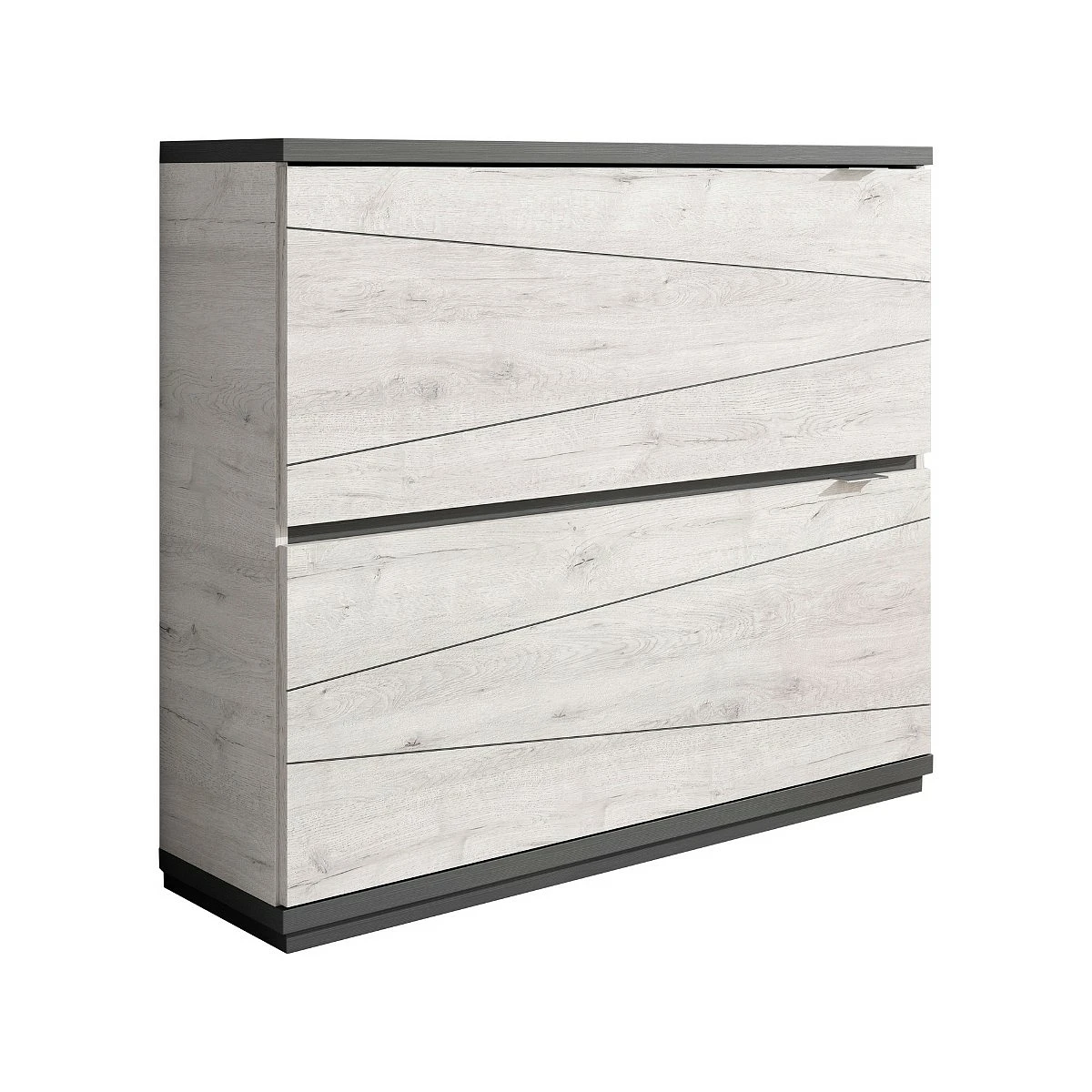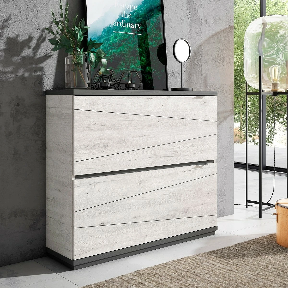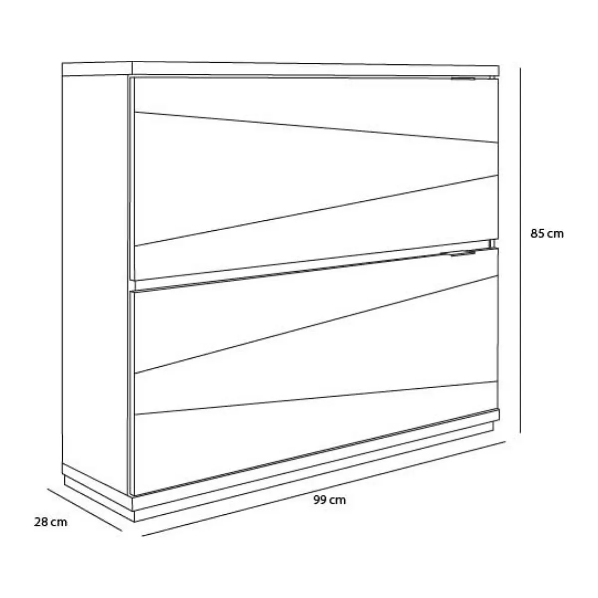 Este zapatero no pasa desapercibido. Las líneas diagonales sobre el frontal en acabado Mozart aportan un toque de originalidad sin romper la armonía visual del entorno. La combinación de tonos claros y oscuros añade profundidad y sofisticación, lo que lo convierte en un mueble decorativo además de práctico. Su formato compacto encaja perfectamente en pasillos estrechos, recibidores pequeños o como complemento en el dormitorio.