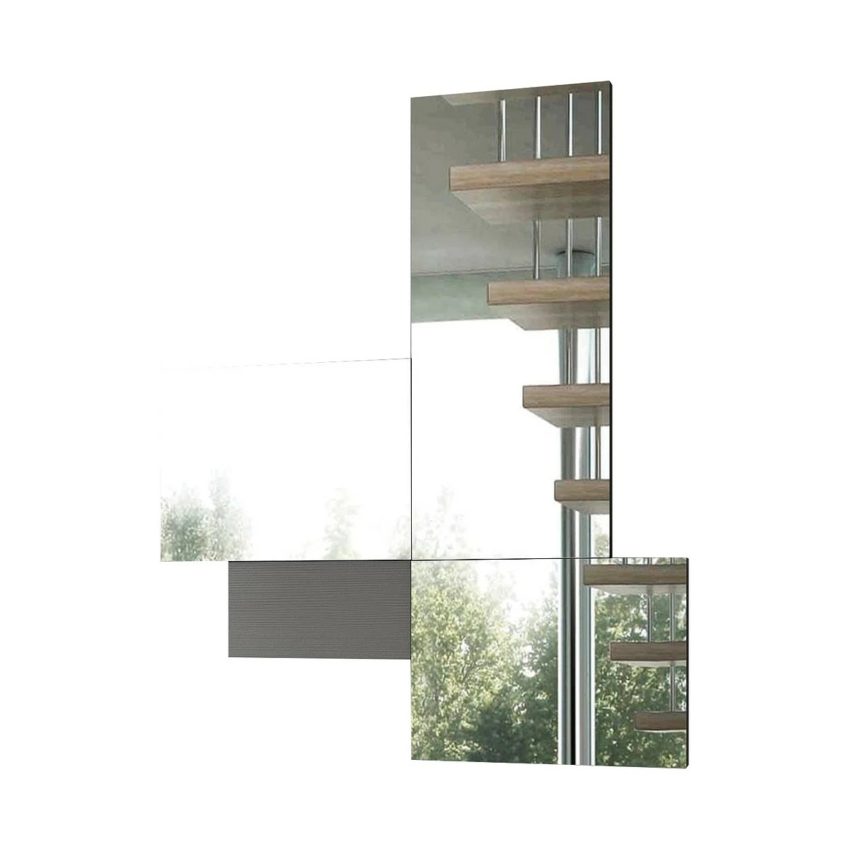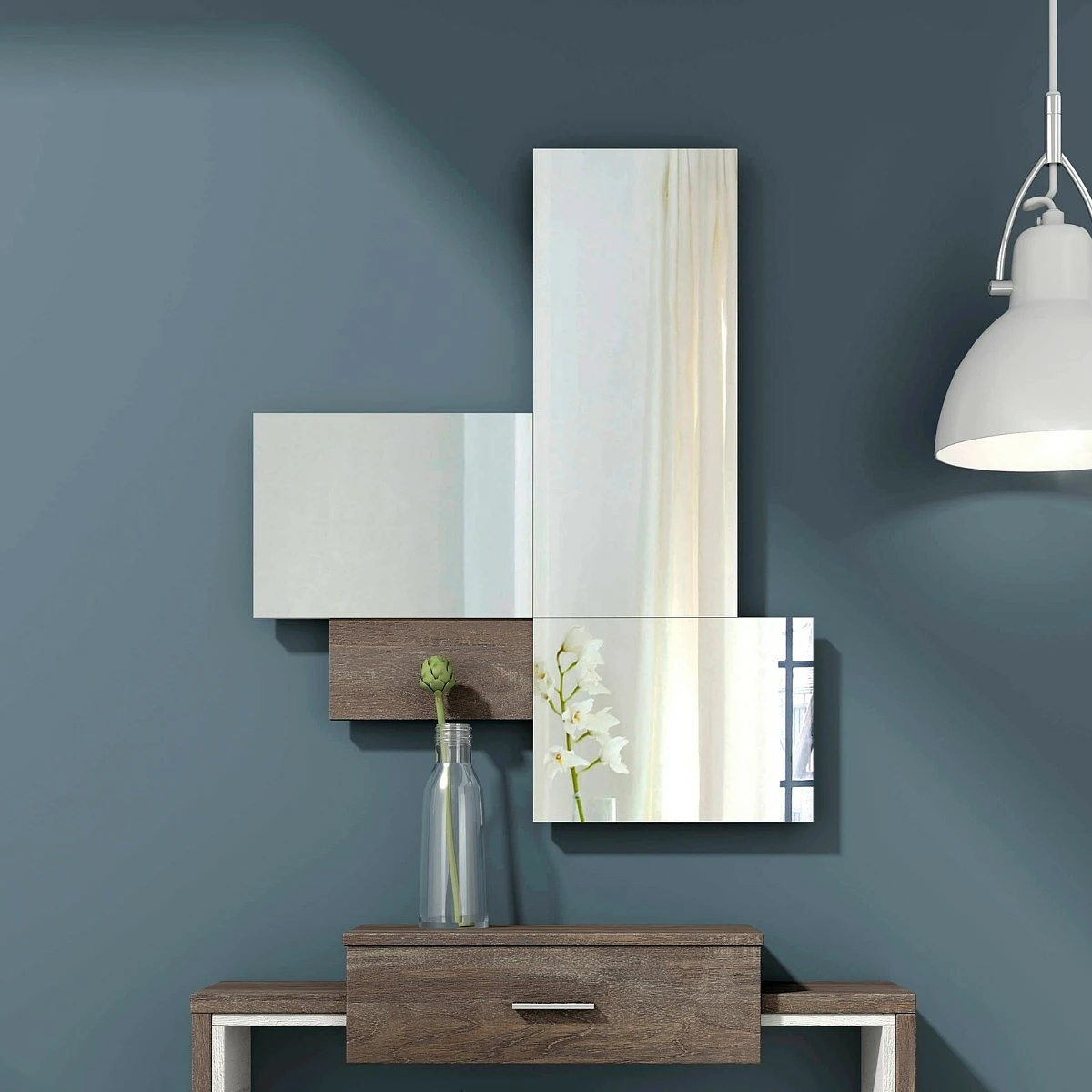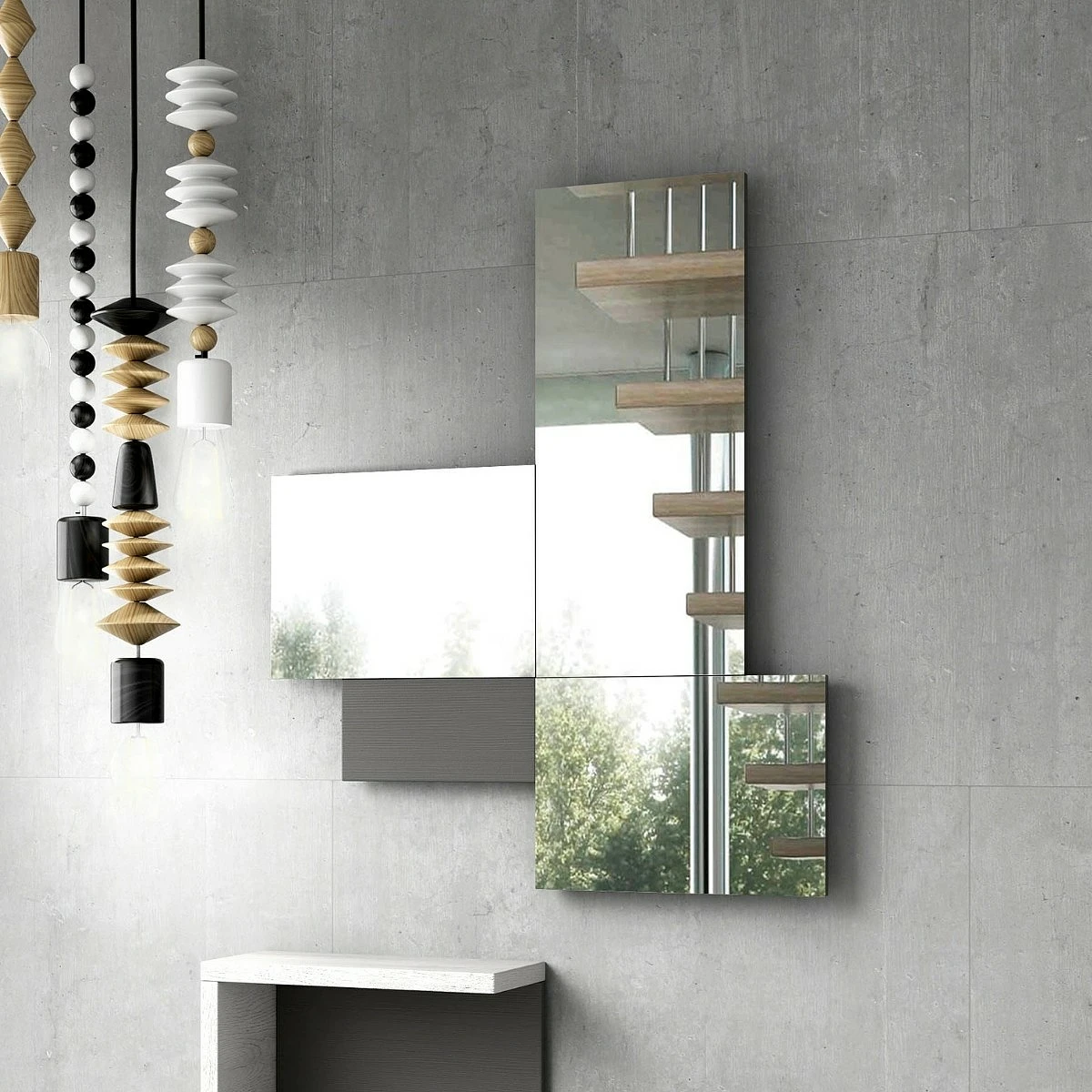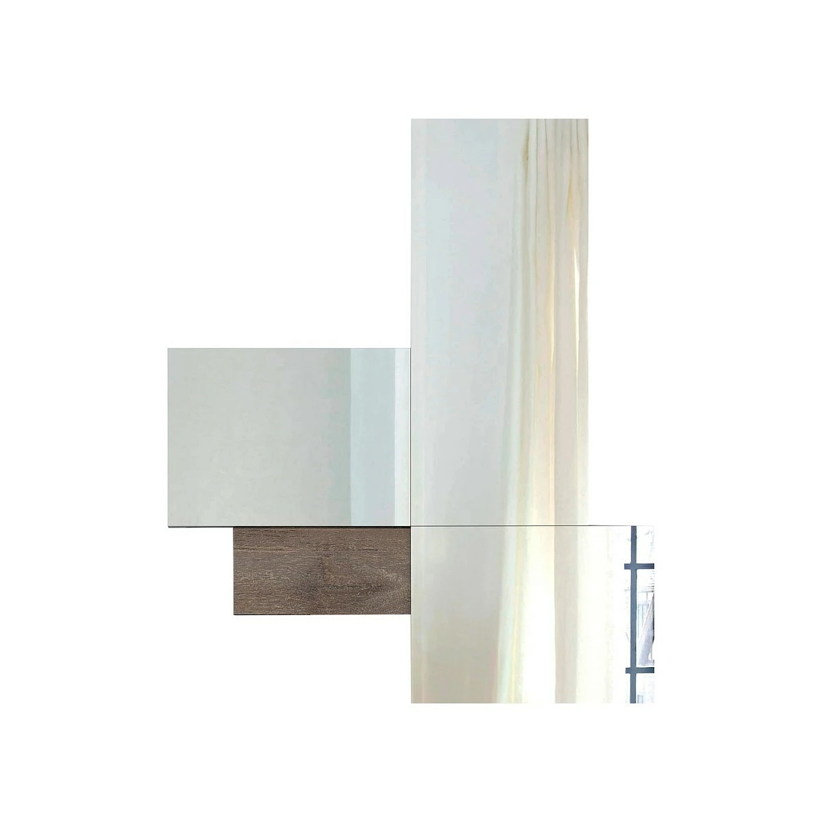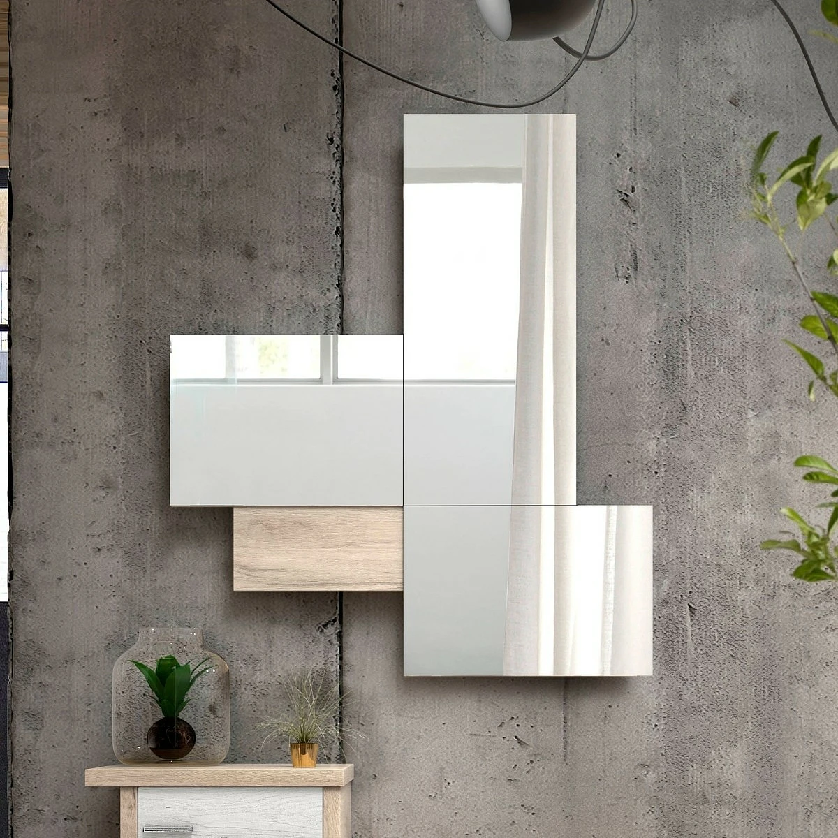 El diseño de este espejo rompe con las formas tradicionales. Su composición de paneles desalineados genera dinamismo y volumen, mientras que el fondo en roble claro suaviza el conjunto, aportando calidez visual. Esta combinación permite que se integre fácilmente en ambientes modernos o de inspiración escandinava.