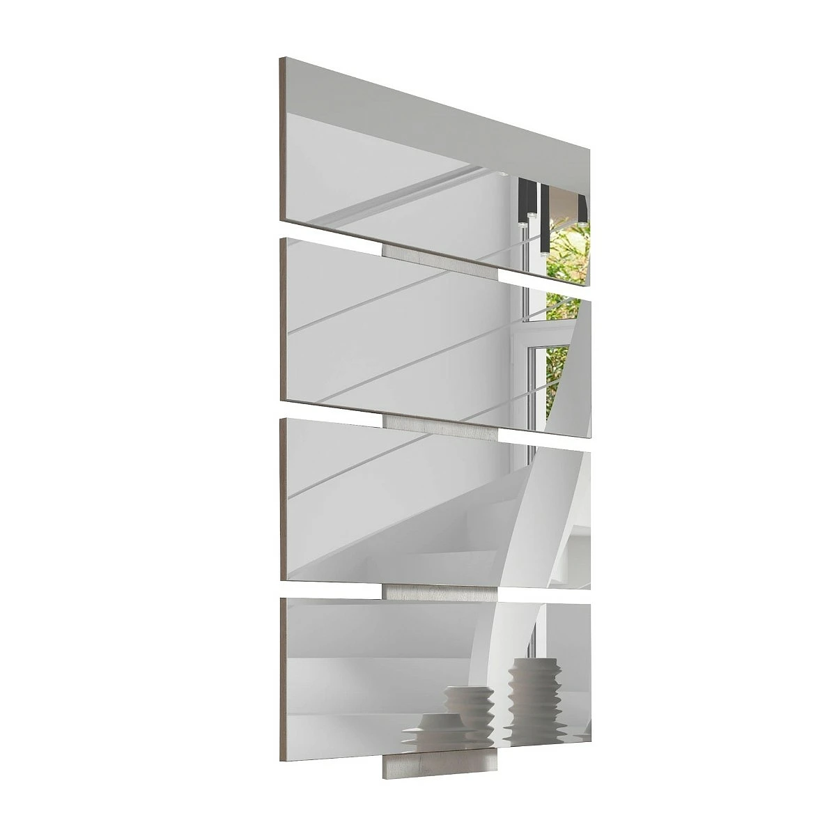 Este espejo no solo cumple una función práctica, sino que también actúa como un elemento decorativo de gran impacto visual. Su composición en cinco bandas separadas crea un ritmo dinámico que juega con la luz y la perspectiva, aportando profundidad a la pared donde se instala. Es ideal para acompañar muebles bajos o consolas modernas en el recibidor.