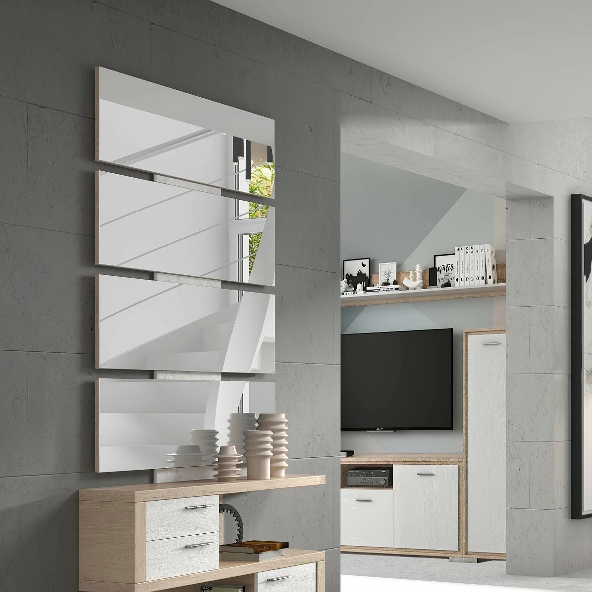 Este espejo moderno por paneles se adapta a distintas estancias del hogar, aportando una sensación de orden y estilo. Sobre un aparador, en un recibidor o como elemento decorativo en una zona de paso, su diseño original destaca sin sobrecargar el entorno.