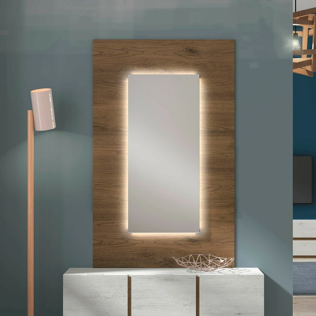 Gracias a la versión con luz LED integrada, este espejo también actúa como una fuente de iluminación secundaria que transforma el ambiente por completo. En un salón con poca luz natural, puede colocarse estratégicamente para iluminar zonas de lectura o destacar una pared vacía. En el baño, aunque no es su uso principal, puede complementar el estilo rústico o natural del mobiliario.