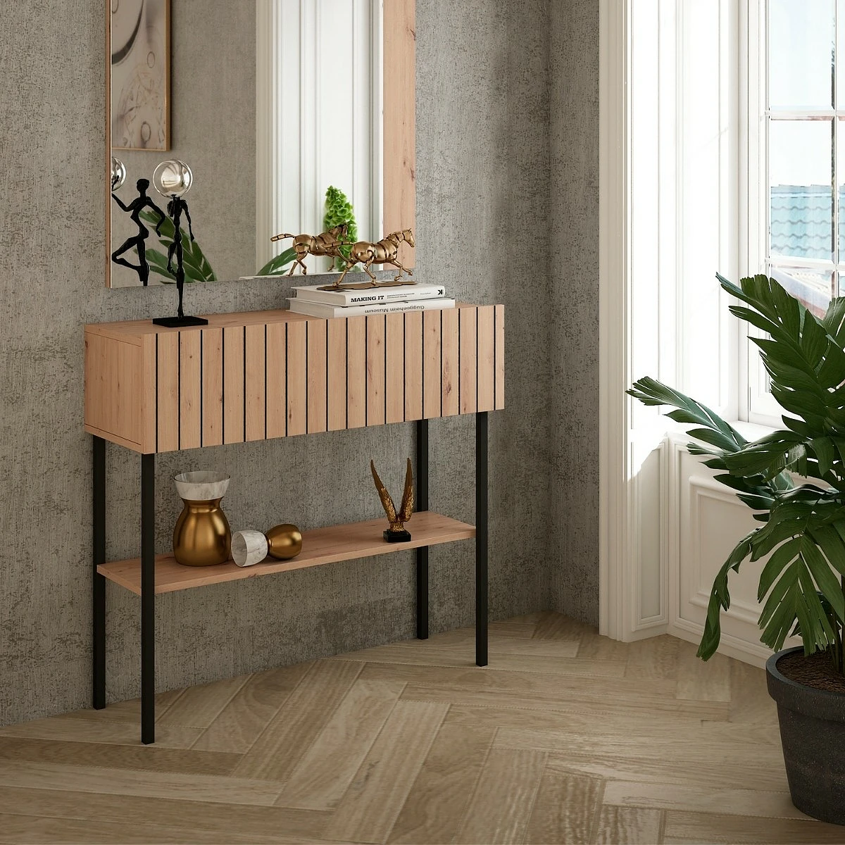 La consola logra el equilibrio perfecto entre lo sobrio y lo expresivo. Su diseño minimalista pero con detalles marcados —como los listones verticales— permite integrarla en ambientes escandinavos, modernos e incluso rústicos contemporáneos. La tonalidad del roble amazona aporta luz sin restar calidez.