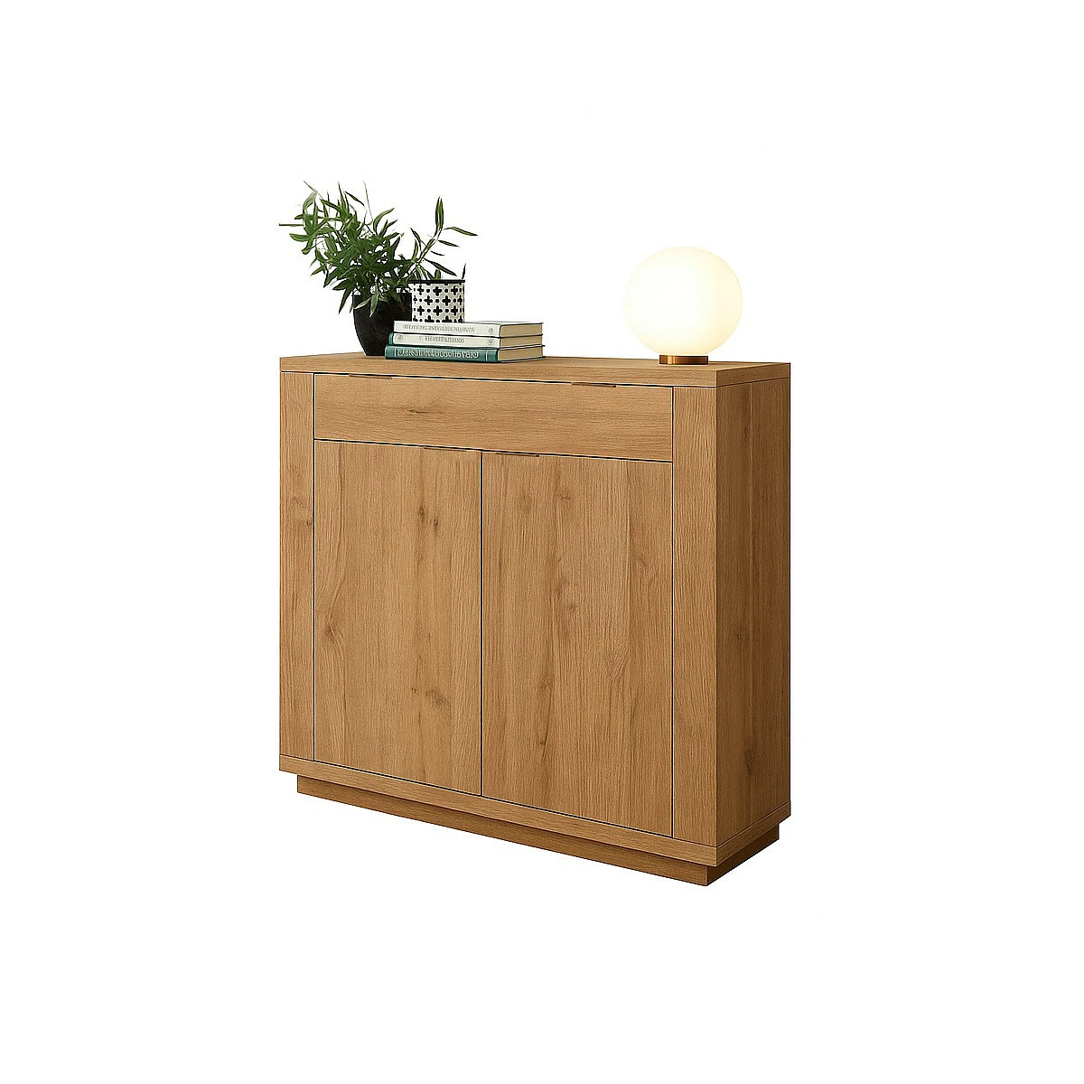 La Consola 87x81x28 cm está equipada con dos puertas inferiores que ocultan un amplio espacio para guardar objetos del día a día, desde calzado hasta artículos de hogar. Además, el cajón superior es perfecto para mantener a mano elementos como llaves, correspondencia o pequeños accesorios.