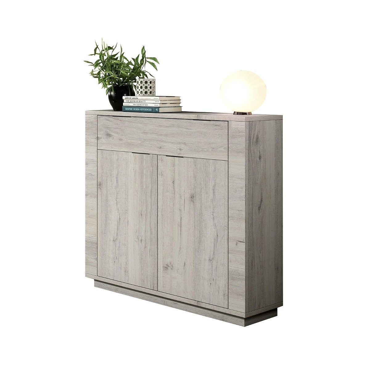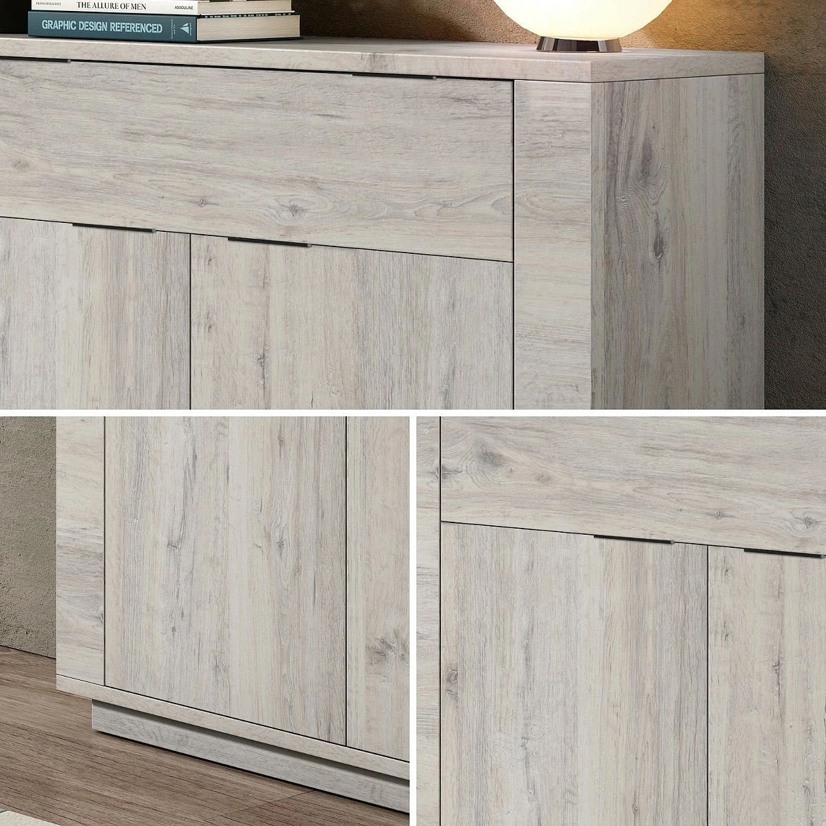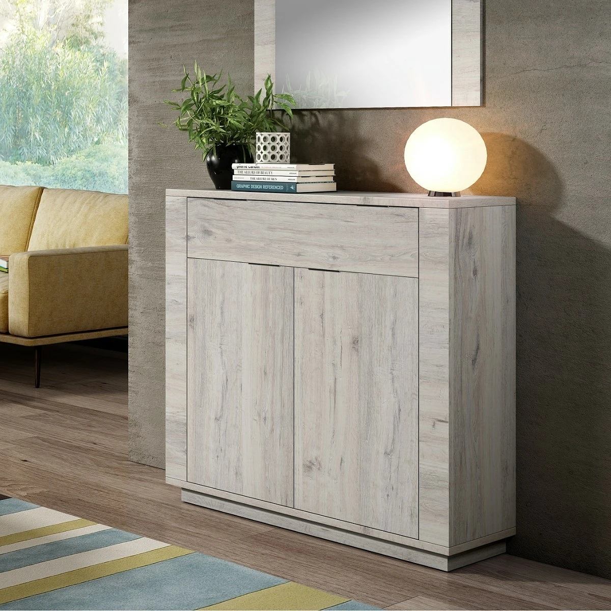 La Consola 87x81x28 cm está equipada con dos puertas inferiores que ocultan un amplio espacio para guardar objetos del día a día, desde calzado hasta artículos de hogar. Además, el cajón superior es perfecto para mantener a mano elementos como llaves, correspondencia o pequeños accesorios.