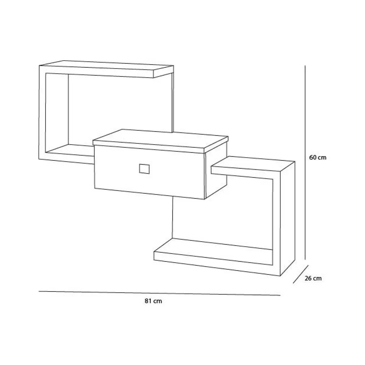 El formato en tres niveles de este mueble permite una composición visual dinámica y práctica. Los cubos laterales abiertos ofrecen una zona accesible para colocar objetos decorativos o de uso diario como llaves, correo o plantas pequeñas. El cajón central con tirador cuadrado metálico añade capacidad oculta, ideal para mantener el orden visual.