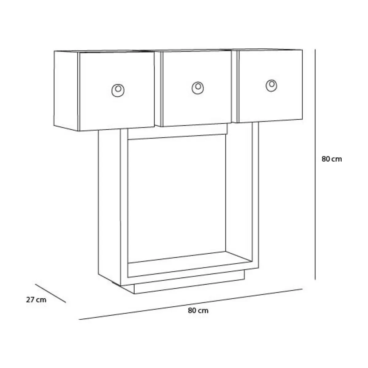 Este mueble destaca por su formato compacto y muy bien organizado. Los tres cajones alineados son ideales para guardar objetos pequeños como llaves, gafas, cargadores o correspondencia. La bandeja inferior abierta es perfecta para colocar un libro, una planta o una caja decorativa que complemente el espacio.