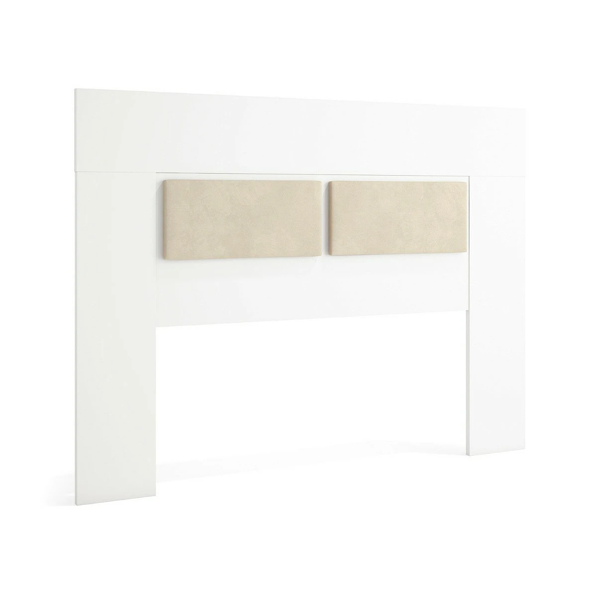 Este cabecero destaca por su diseño acolchado y funcional, pensado para ofrecer tanto estilo como bienestar. Los dos cojines tapizados proporcionan un cómodo respaldo para leer, ver series o simplemente descansar. Además, el contraste entre el blanco brillante del marco y los tonos suaves de los cojines crea un juego visual armónico.