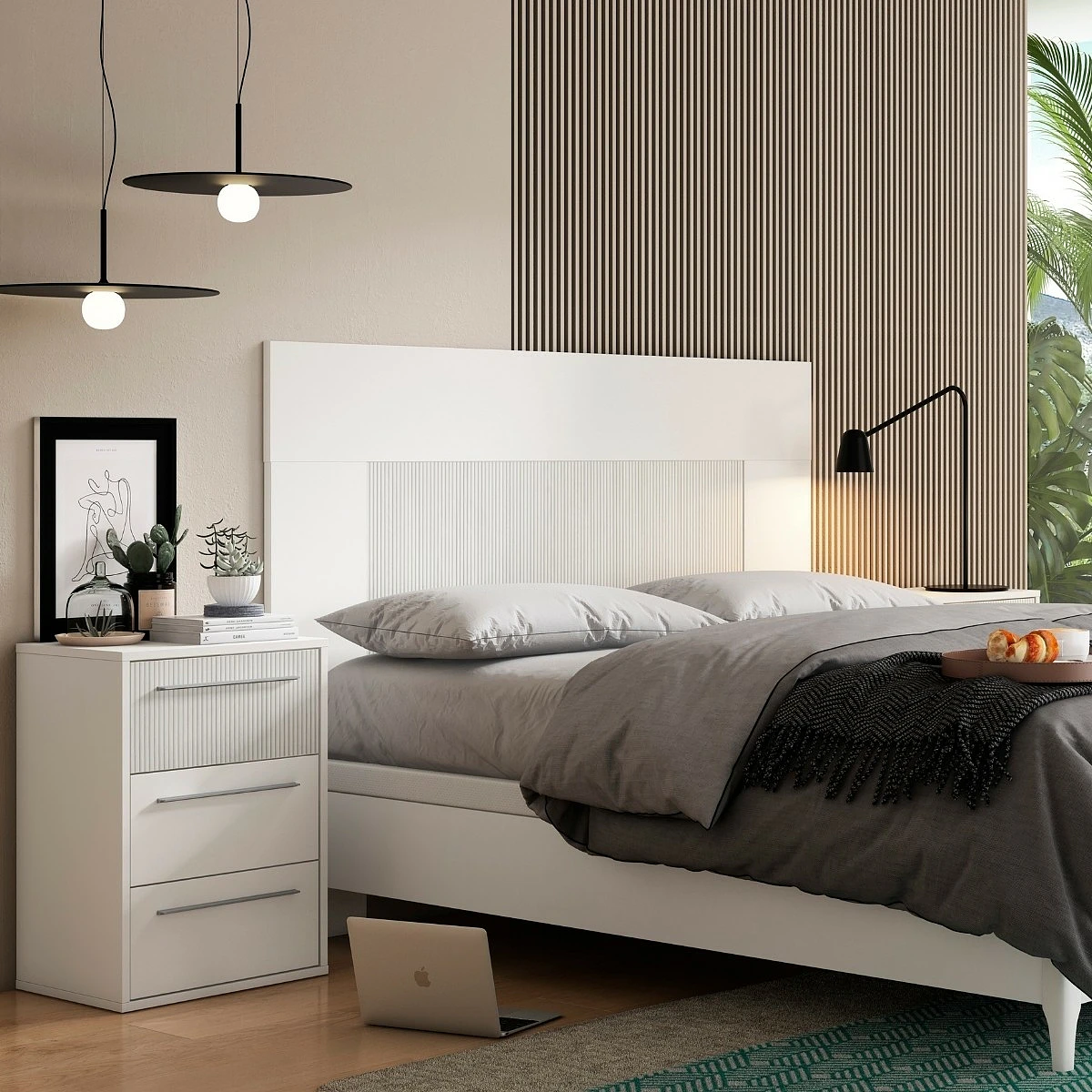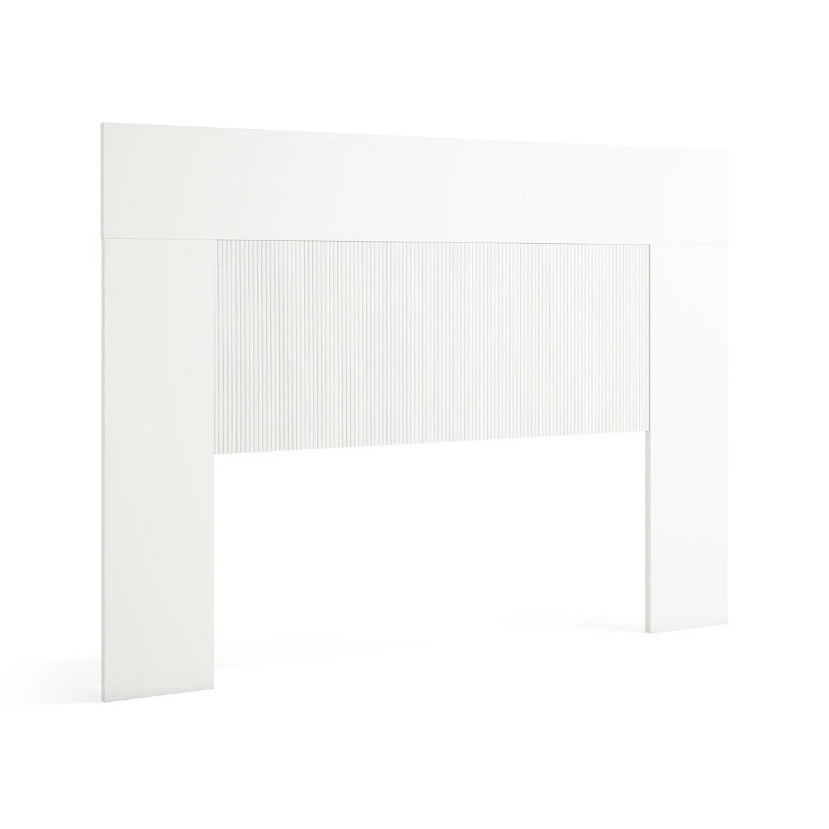 La combinación de blanco puro y savana claro genera un ambiente tranquilo y luminoso, perfecto para favorecer el descanso. El detalle estriado del panel central añade profundidad y textura sin romper la armonía del conjunto. Su formato rectangular y proporciones proporcionadas lo convierten en una pieza visualmente equilibrada que realza la cama como punto focal del dormitorio.