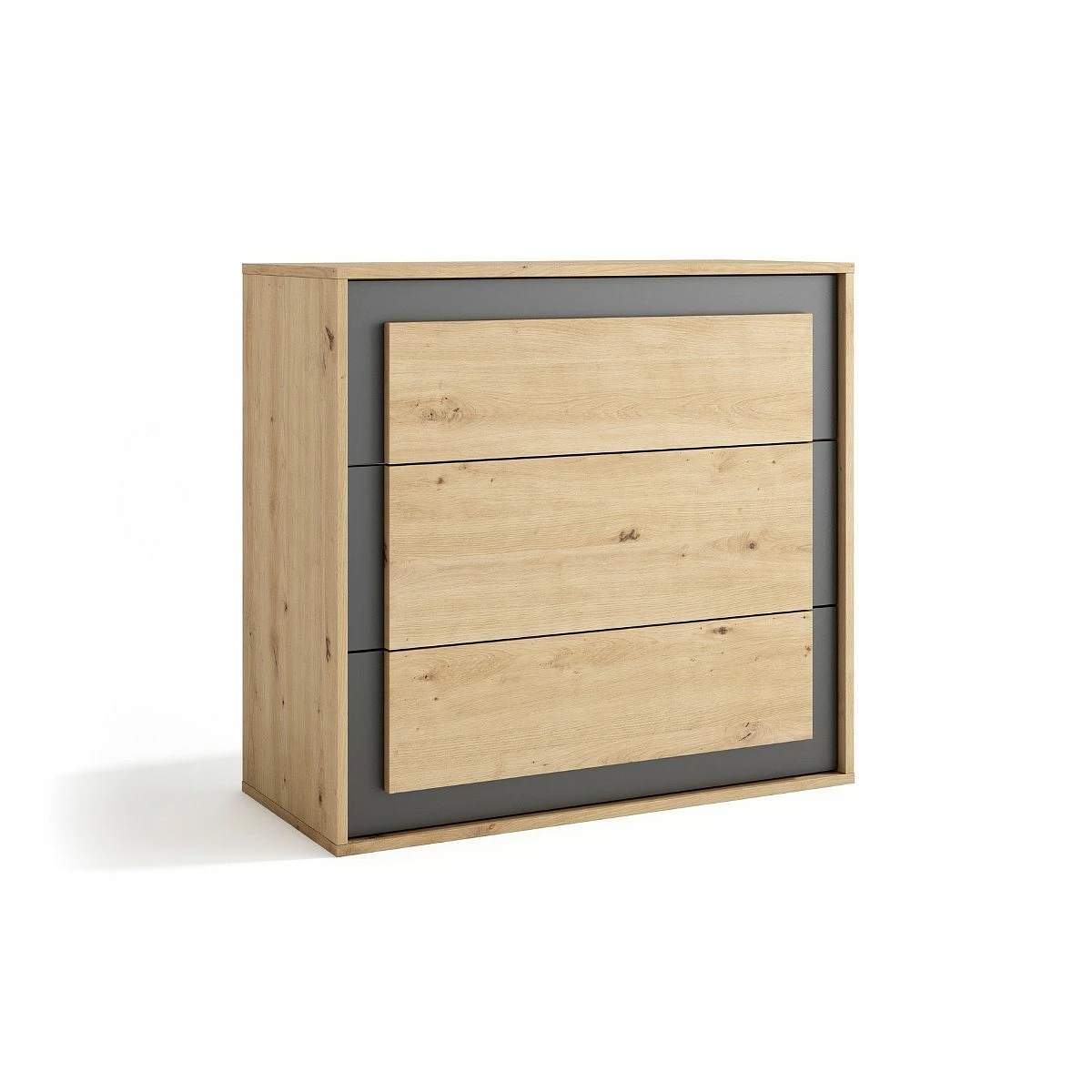 Las mesitas de noche con tres cajones te ofrecen mucho más que un simple apoyo. Son ideales para organizar todo lo que necesitas tener a mano: libros, accesorios personales, cargadores o pequeños objetos. La cómoda amplia complementa perfectamente el conjunto, proporcionando un espacio extra para guardar ropa doblada, mantas o documentación sin perder estilo.