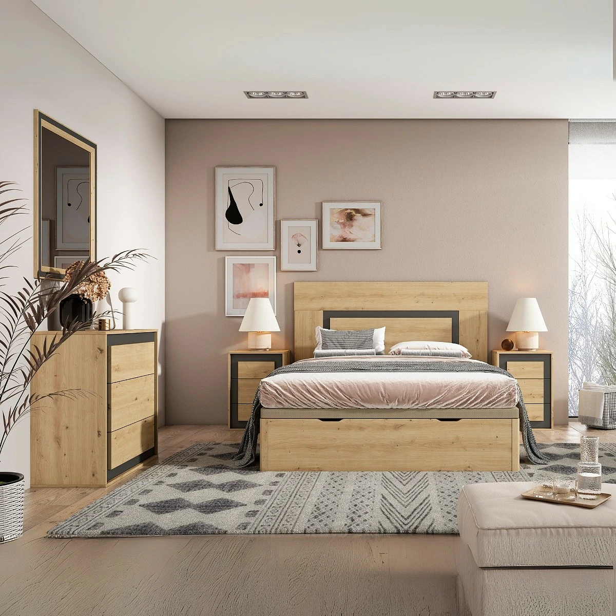 Este conjunto ha sido diseñado para facilitar la armonía en el espacio. Cada pieza está pensada para integrarse con fluidez en la habitación, creando un entorno que invita al descanso. Añade cojines suaves, mantas de lana o plantas secas para completar una decoración natural y serena. Es una propuesta ideal para quienes buscan muebles funcionales sin renunciar al diseño.