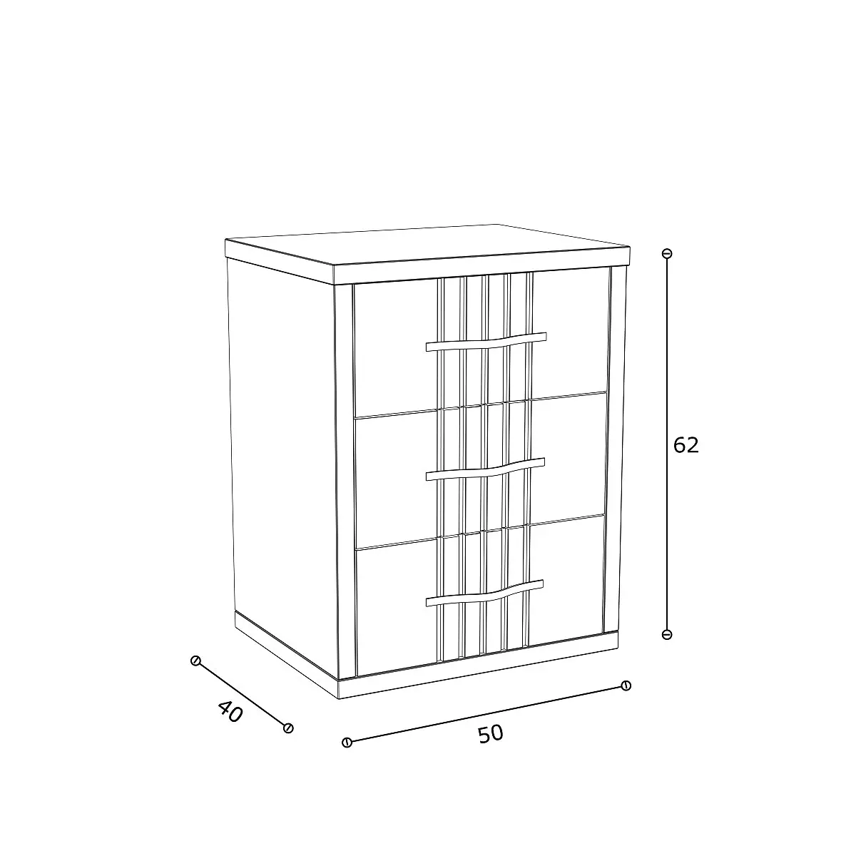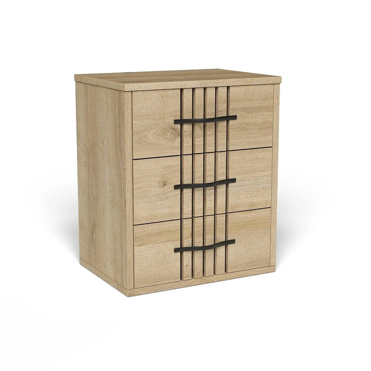 La estética de la mesita Dakota destaca por su original diseño frontal, con una composición de listones verticales que enmarcan los tiradores metálicos negros. Este detalle le da un carácter distintivo sin sobrecargar visualmente, ideal para crear ambientes serenos con un toque decorativo sofisticado.