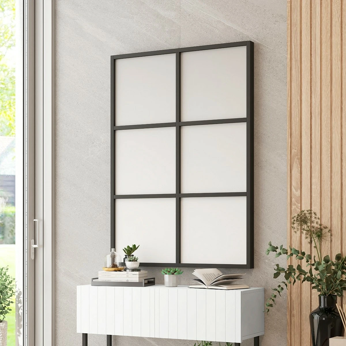 Este espejo de pared no solo cumple una función práctica, sino que también se convierte en un elemento decorativo indispensable. Gracias a su diseño sobrio con cuadrícula, aporta un aire contemporáneo que combina perfectamente con muebles claros, maderas naturales o incluso paredes oscuras que buscan contraste. En tonos blanco y negro, puedes seleccionar la versión que mejor armonice con tu decoración actual.
