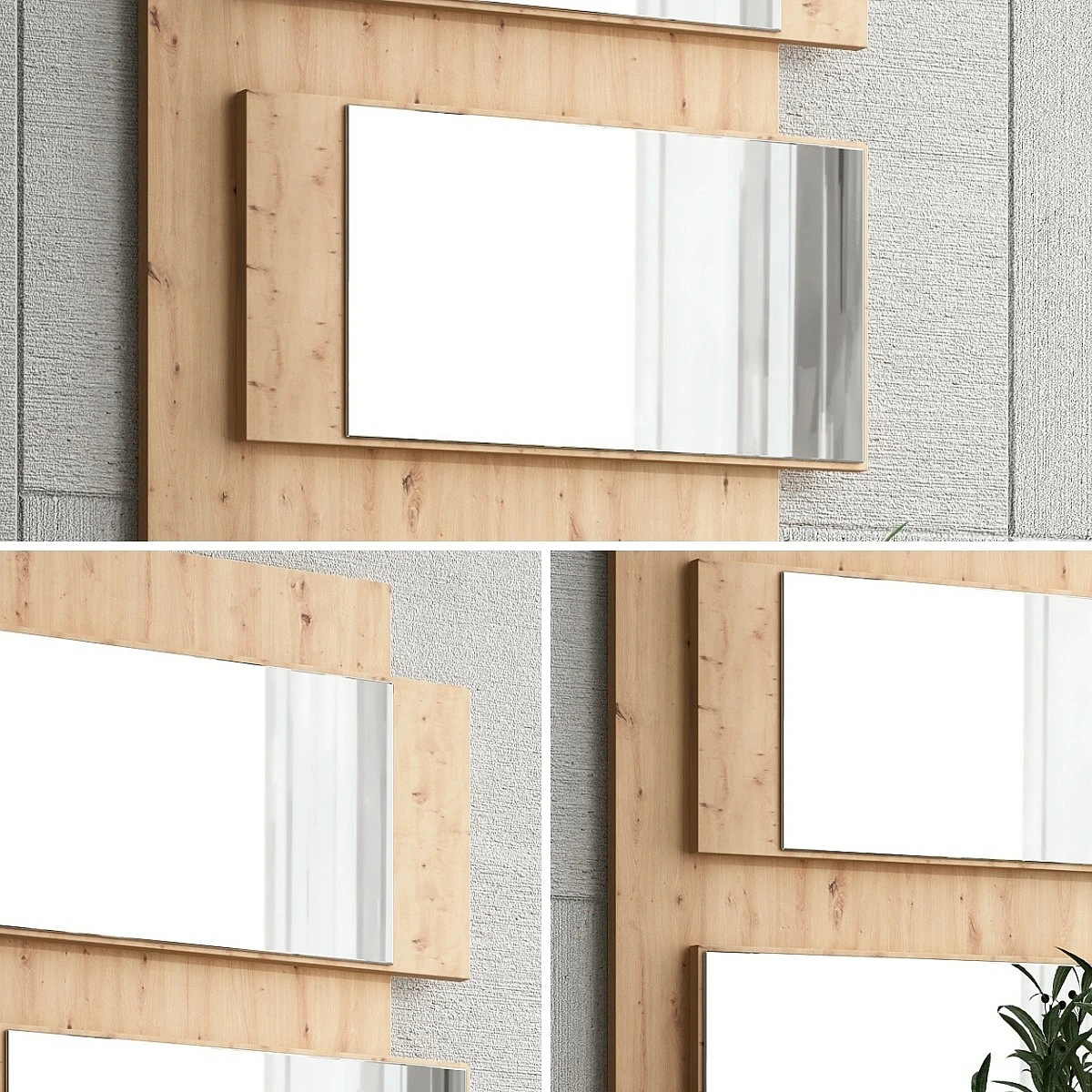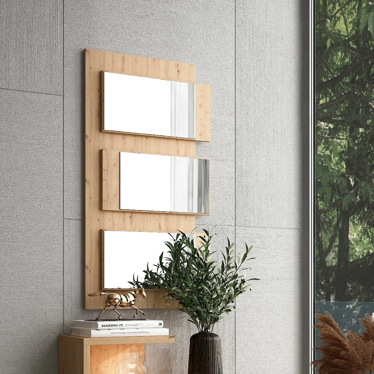 Este espejo destaca por su diseño de líneas limpias con una base cálida en acabado roble Amazona que aporta textura y naturalidad a cualquier entorno. Los tres espejos rectangulares se disponen en forma vertical con un efecto visual asimétrico que añade dinamismo sin romper la armonía del conjunto.