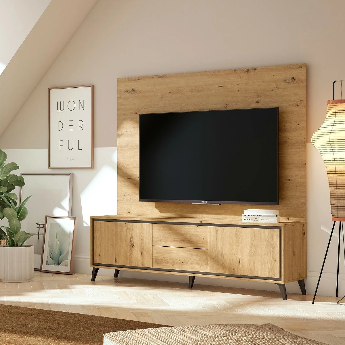 La trasera de TV en madera refuerza la presencia visual del televisor, lo convierte en un elemento decorativo más y protege la pared. El conjunto funciona muy bien en espacios abiertos, salones con techos inclinados o zonas multifuncionales gracias a su diseño compacto y elegante.