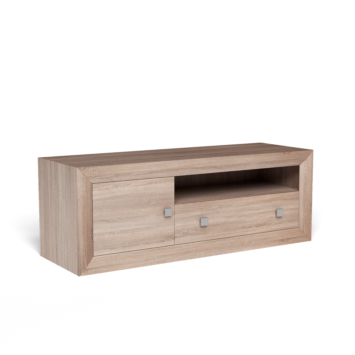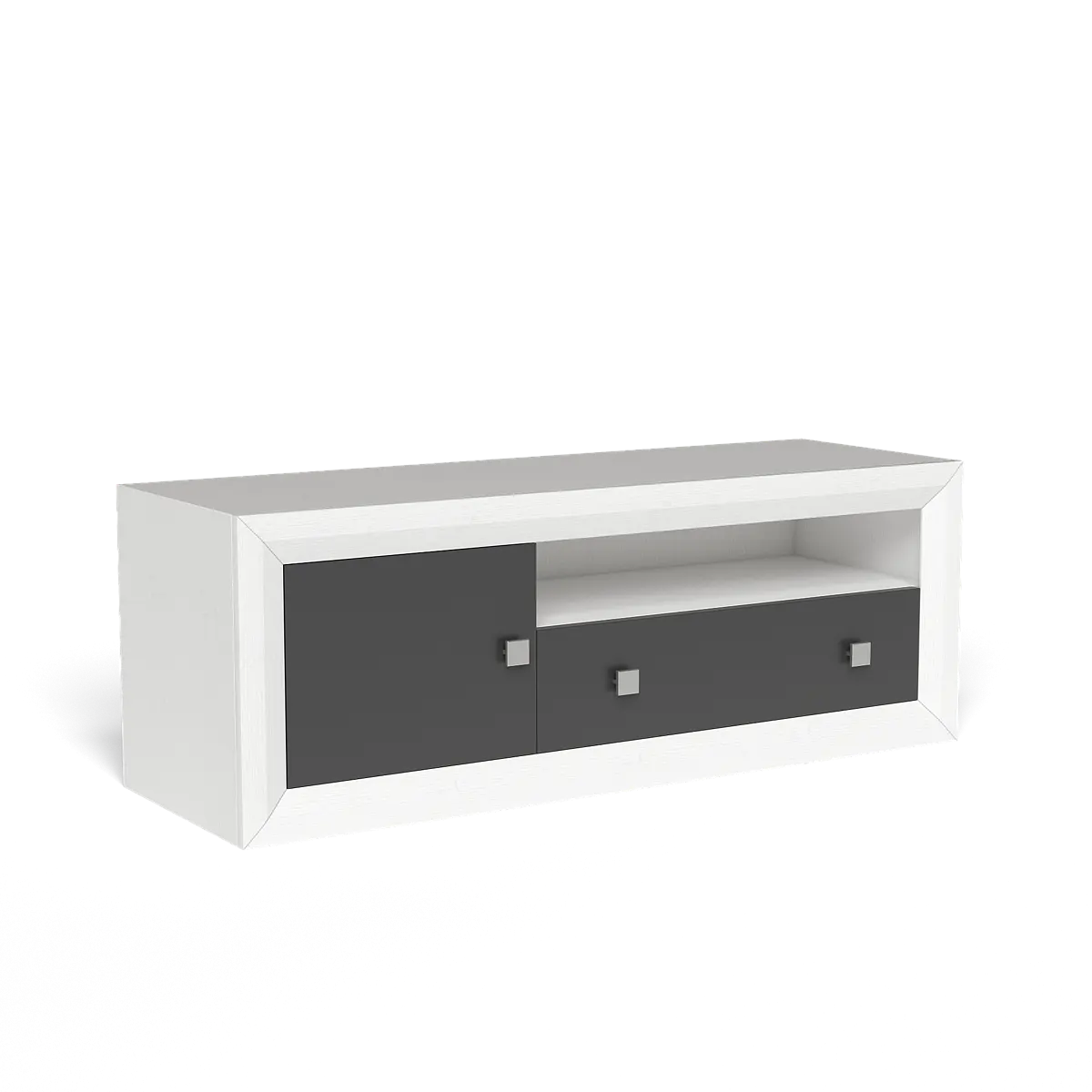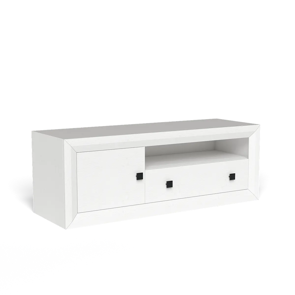• Bajo TV: 55 cm (alto) x 140 cm (ancho) x 40 cm (fondo), con 1 puerta blanca, 1 cajón blanco y hueco central abierto.