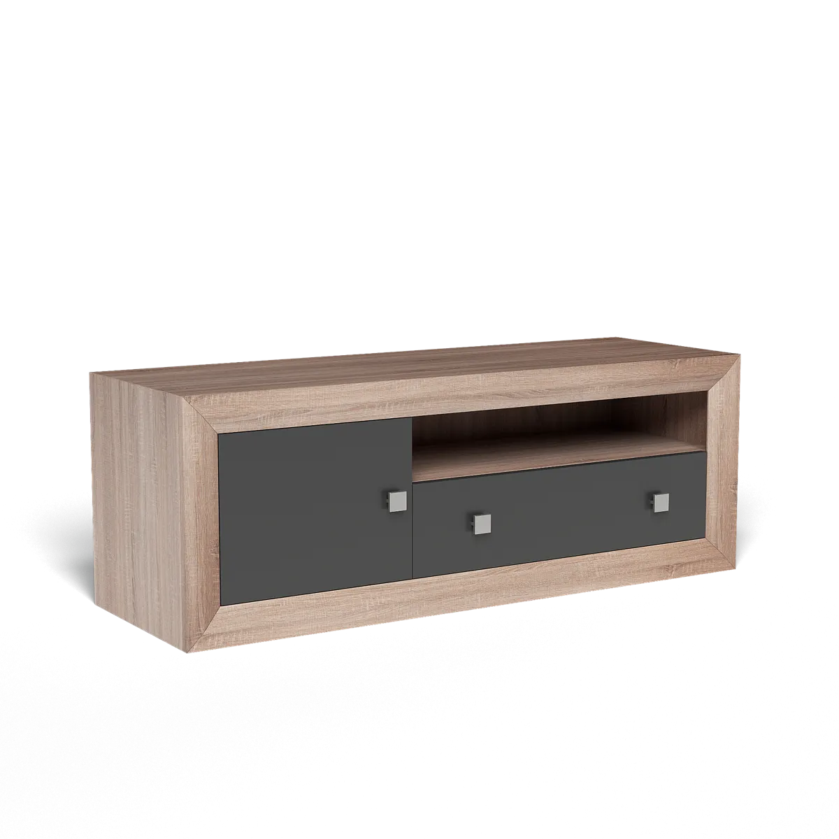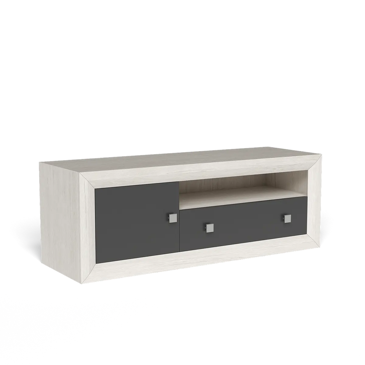 El conjunto ofrece múltiples espacios para organizar el salón de forma práctica y estética. El mueble de televisión ofrece una solución completa: el cajón y la puerta blanca ocultan pequeños objetos, mientras el hueco abierto es ideal para el reproductor, consola o libros. Su tamaño permite colocar televisores grandes sin perder proporción en la estancia.