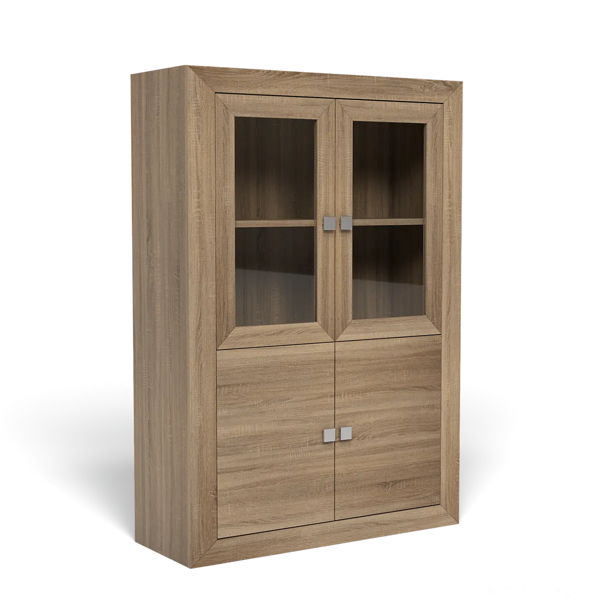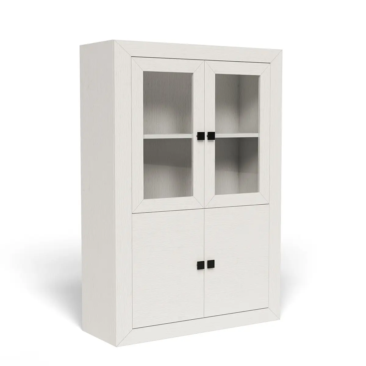 Las proporciones de cada módulo están pensadas para ofrecer equilibrio: la vitrina alta, con su estructura vertical, enmarca el espacio sin sobrecargarlo. Sus cristales permiten una exhibición elegante de vajilla o decoración, mientras los cajones inferiores añaden funcionalidad. Todo ello con una estética pulida y coherente.