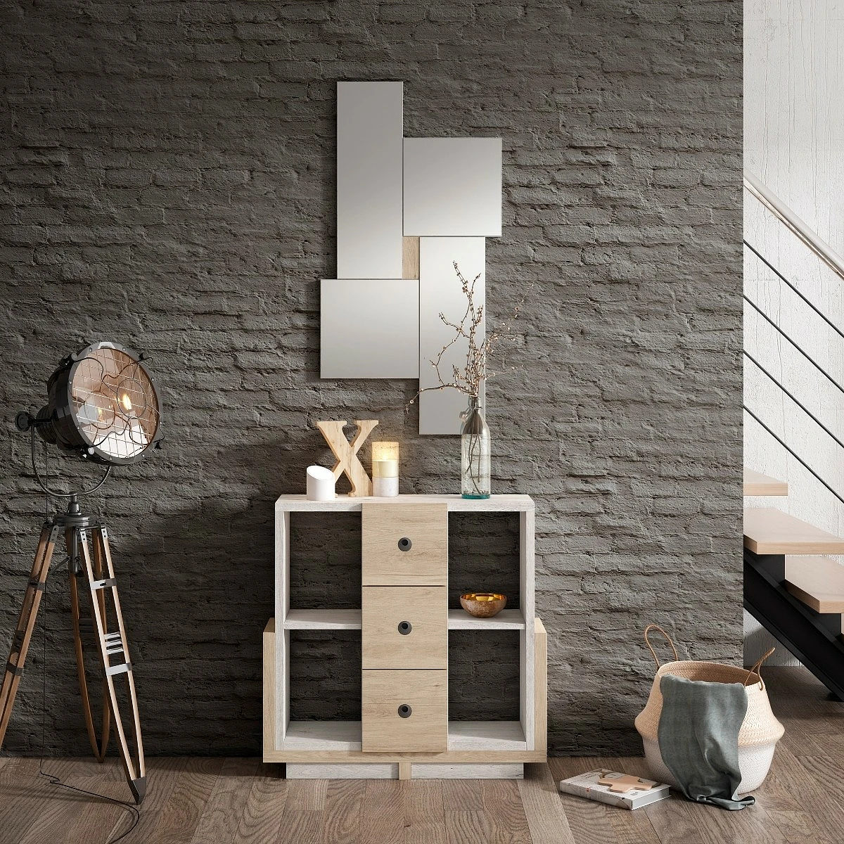 El espejo incluido no es solo funcional, también es un elemento decorativo clave. Su diseño tipo collage con paneles rectangulares de distintos tamaños crea profundidad y movimiento visual. Esta pieza vertical ayuda a ampliar el espacio y aporta más luz al recibidor, ideal si tu entrada no cuenta con ventanas o es estrecha.