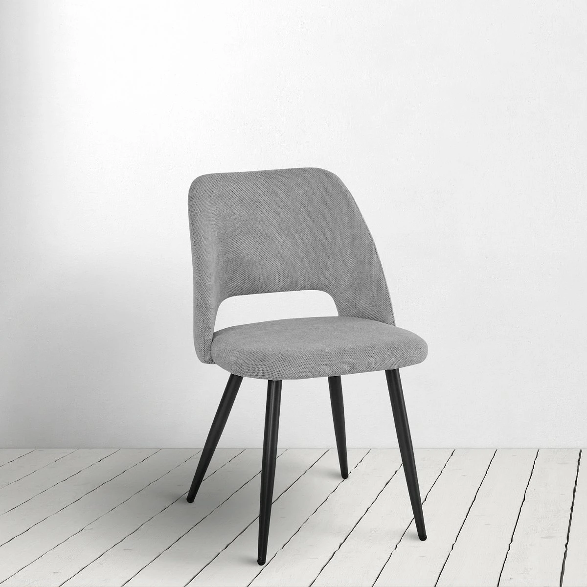 Las sillas FLORA destacan por su diseño diferente: un respaldo curvo que envuelve suavemente la espalda, con una abertura inferior que aporta ligereza visual y mejora la ventilación. Su base cónica estilizada en negro crea una presencia elegante pero informal, perfecta para comedores con un aire contemporáneo.
