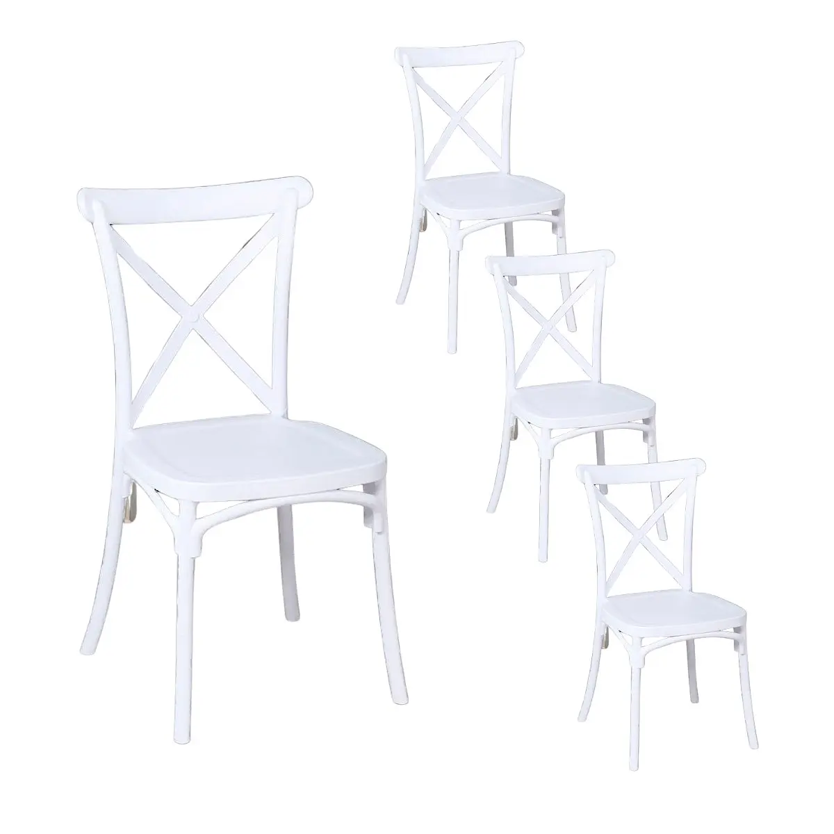 Disponibles en blanco o negro, estas sillas ofrecen dos posibilidades decorativas muy distintas: el blanco aporta claridad, amplitud y un aire romántico ideal para celebraciones o ambientes neutros, mientras que el negro resalta por su elegancia sobria, perfecta para estilos industriales o minimalistas.