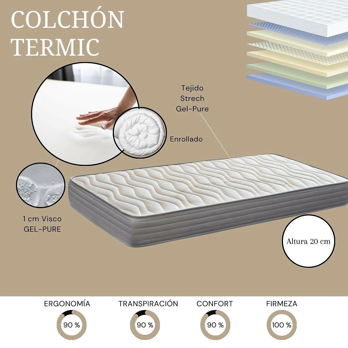 El colchón Térmic incorpora una capa viscoelástica con propiedades termorreguladoras, que ayudan a mantener una temperatura corporal agradable durante el descanso. Esta característica lo convierte en una excelente opción para quienes sufren calor o frío nocturno, ya que se adapta al entorno y al cuerpo, ofreciendo un confort envolvente en cualquier estación del año.