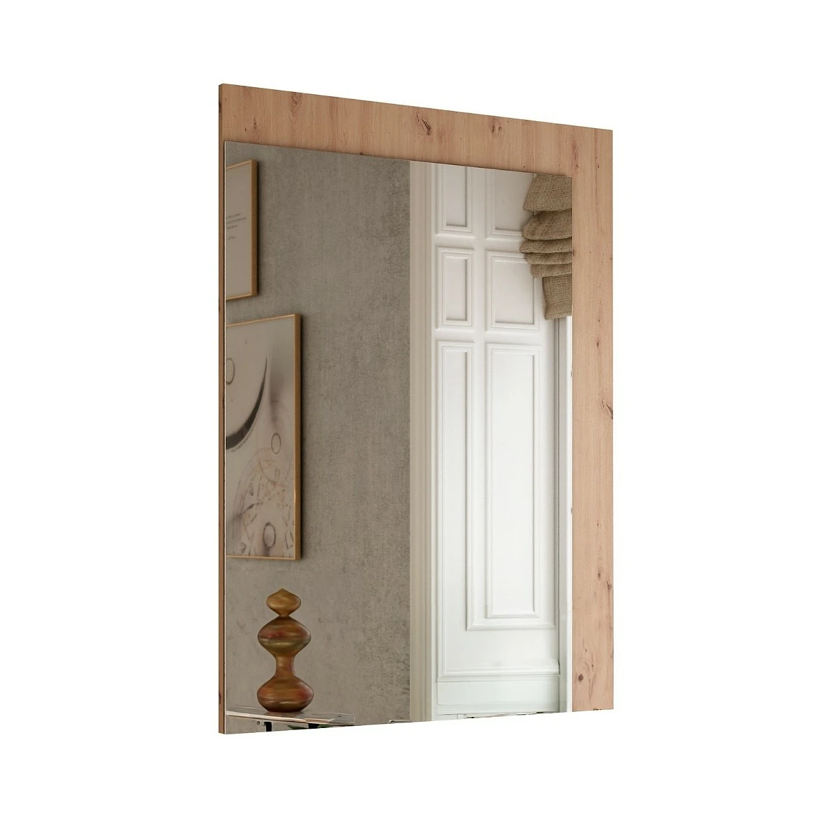 El espejo a juego no solo cumple una función práctica, sino que es un recurso decorativo poderoso. Su tamaño generoso —110 cm de alto— y marco en roble lo convierten en una pieza que potencia la luz y crea profundidad en el recibidor. Es ideal para esos últimos retoques antes de salir de casa, mientras suma elegancia al conjunto.