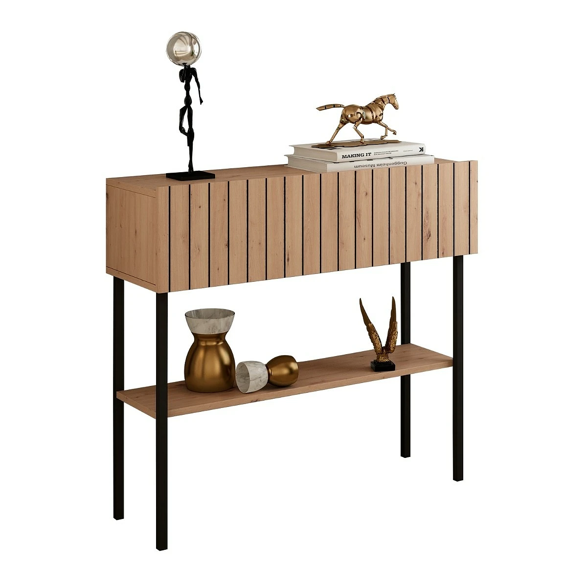Además de su valor estético, la consola incluye una balda inferior que puedes aprovechar para colocar cestas, libros decorativos o jarrones. El compartimento oculto superior es ideal para guardar llaves, correspondencia o pequeños objetos cotidianos, manteniendo el orden sin renunciar al diseño. Su estructura metálica negra da un toque contemporáneo y resistente, que combina con múltiples estilos decorativos.