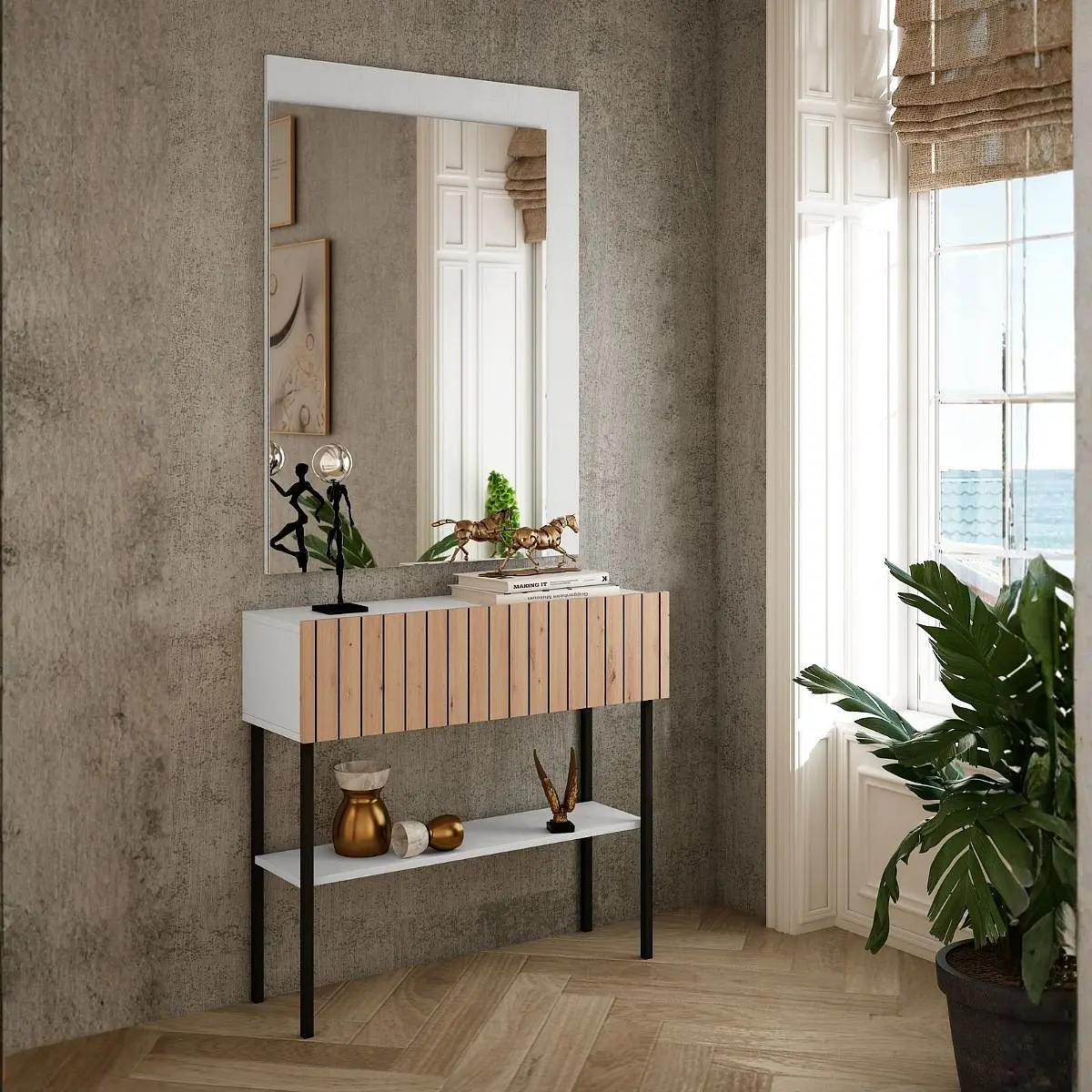 • Incluye: Consola blanca con frontal en roble y espejo a juego (no incluye decoración)