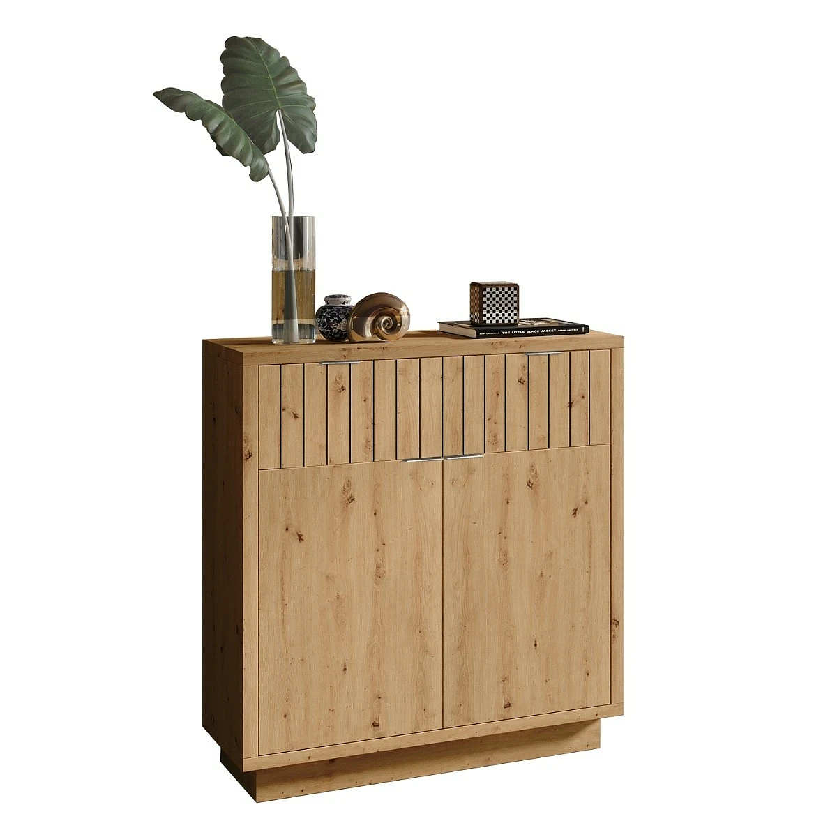 Este conjunto está pensado para crear una bienvenida con presencia, incluso en espacios neutros. El acabado en roble natural, con sus vetas visibles y tonos cálidos, transforma cualquier entrada en un ambiente acogedor. La estructura compacta se adapta bien a distintos tipos de recibidores, y sus líneas verticales decorativas aportan un toque visual distintivo sin recargar.