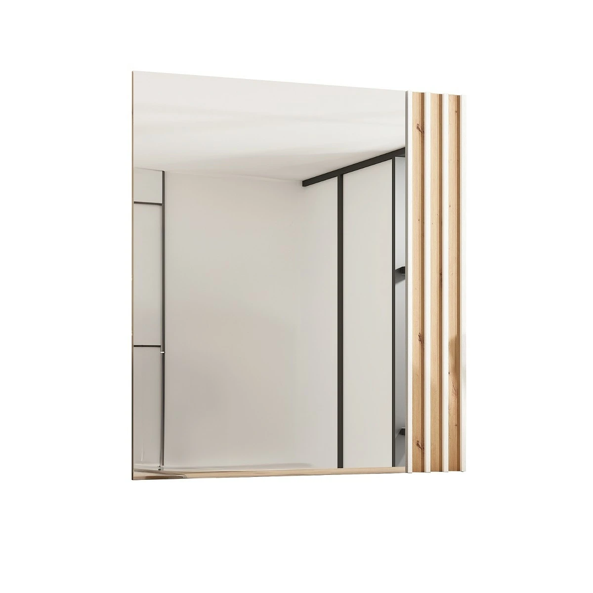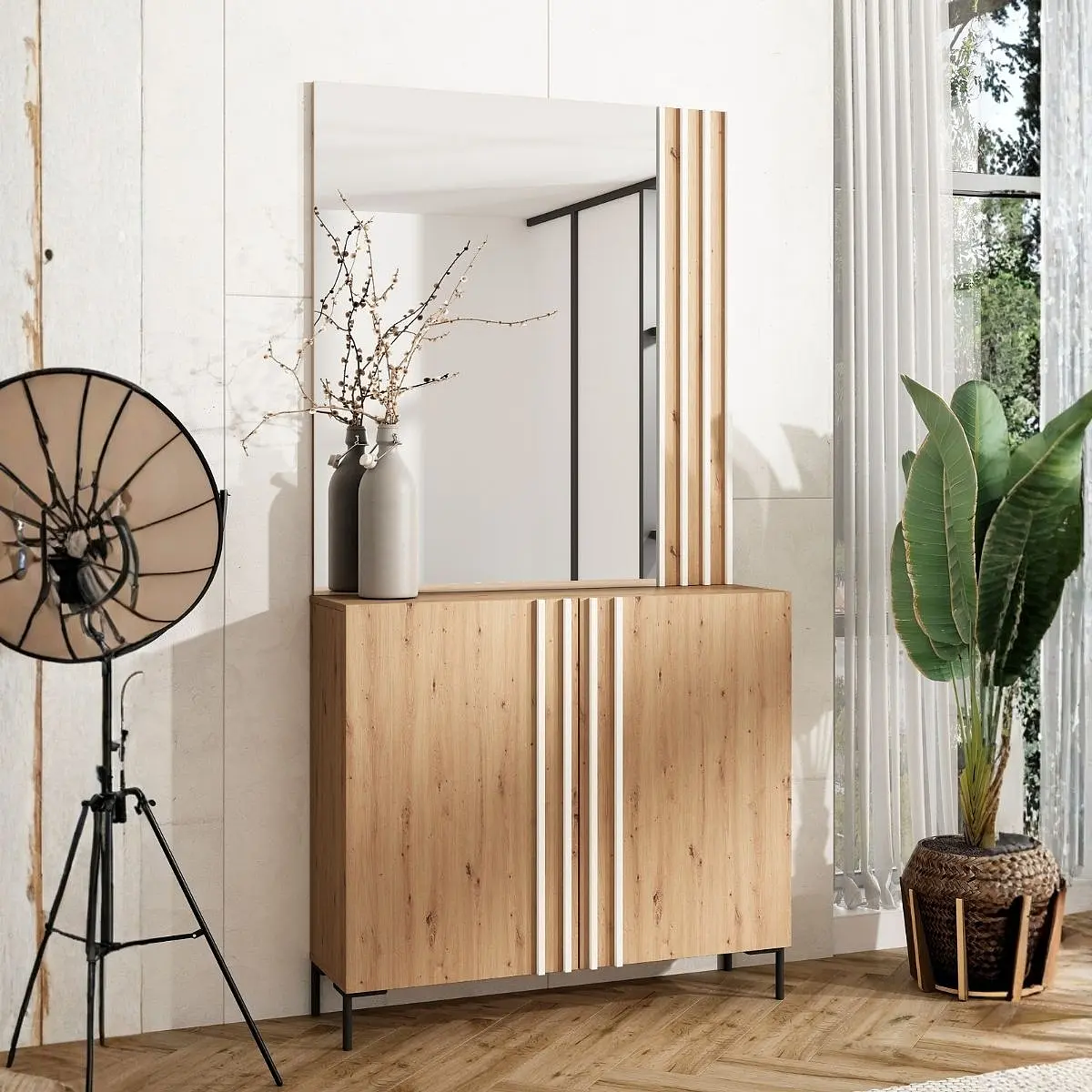 El acabado en roble natural de este conjunto lo convierte en una elección cálida y acogedora, ideal para hogares que buscan una estética serena y moderna. Las líneas verticales estriadas en blanco sobre las puertas y espejo aportan un ritmo visual muy actual, sin caer en lo recargado. Esta combinación genera un efecto de continuidad entre mueble y espejo que equilibra la pared y da sensación de altura.