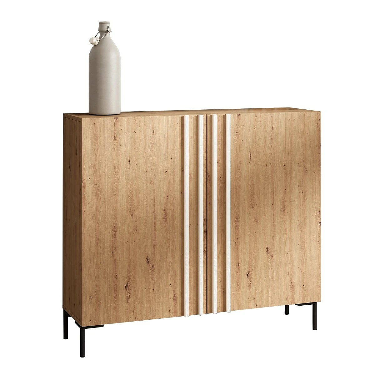 Las tres puertas del mueble ofrecen un amplio espacio interior, perfecto para guardar desde calzado hasta complementos del día a día. Las patas metálicas elevan la consola del suelo, aportando ligereza visual y un toque industrial sutil que combina muy bien con ambientes contemporáneos o escandinavos.