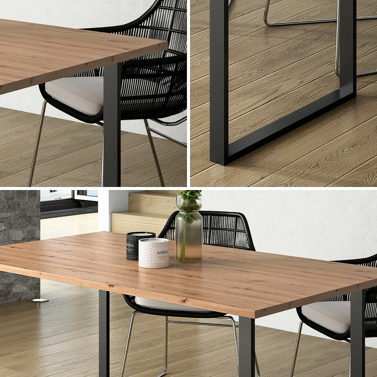 El equilibrio entre la estructura metálica negra y la calidez del sobre en melamina texturizada crea un diseño limpio, contemporáneo y muy acogedor. Las patas en forma de U aportan una presencia firme sin recargar el espacio visual, mientras que el sobre en tonos naturales añade profundidad y confort al ambiente.