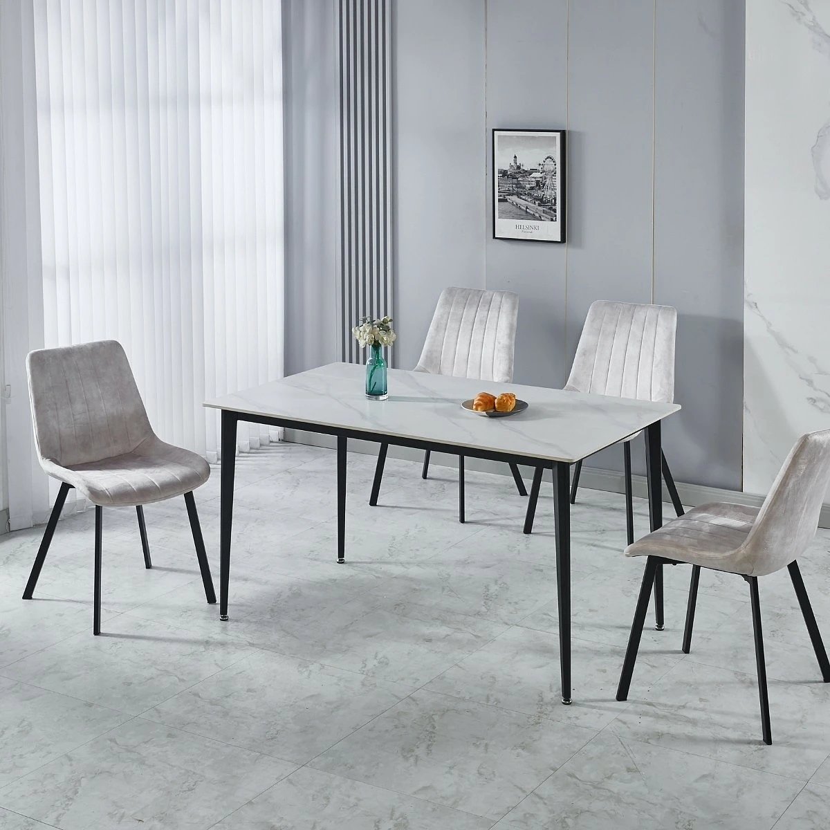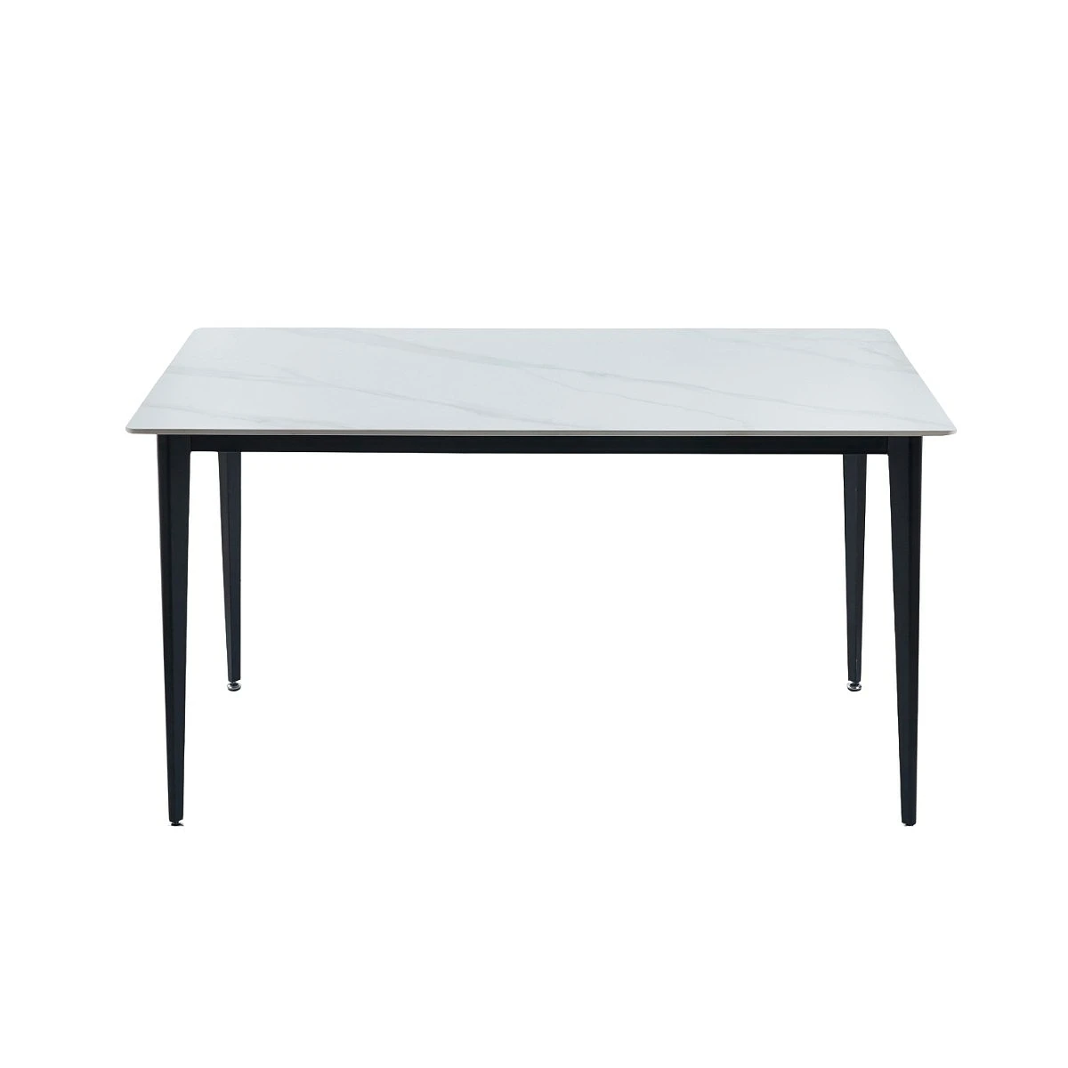 El efecto mármol blanco añade un toque sofisticado que se adapta perfectamente a comedores modernos y espacios neutros. Las patas metálicas negras en forma cónica aportan ligereza visual y equilibrio, manteniendo una gran solidez estructural.