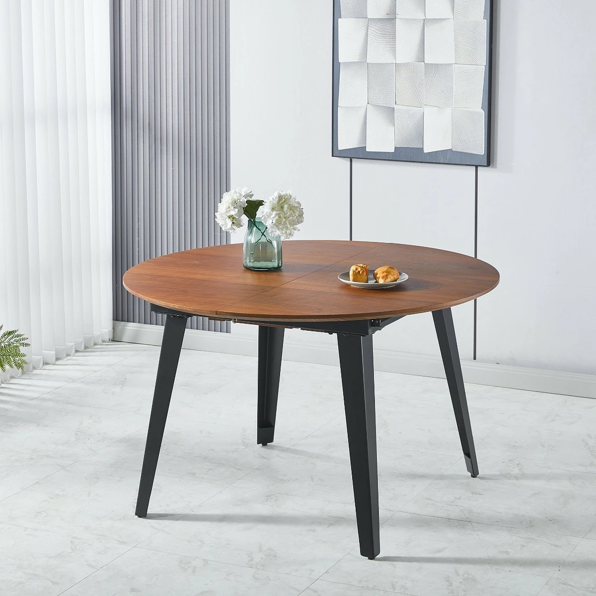 La mesa redonda extensible de chapa nogal ha sido pensada para espacios donde se valoran tanto la estética como la practicidad. En su versión cerrada, es perfecta para el uso diario; en su formato extendido, se adapta con facilidad a reuniones, celebraciones o comidas especiales. Así, puedes aprovechar al máximo cada momento sin preocuparte por el espacio.